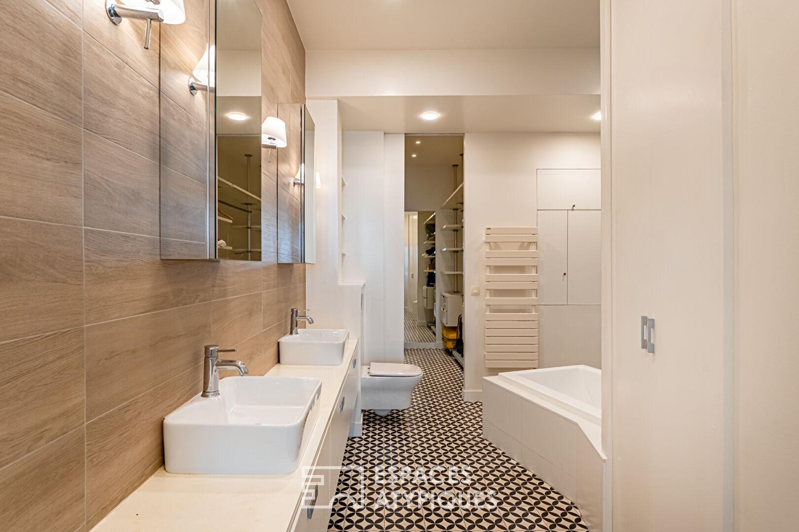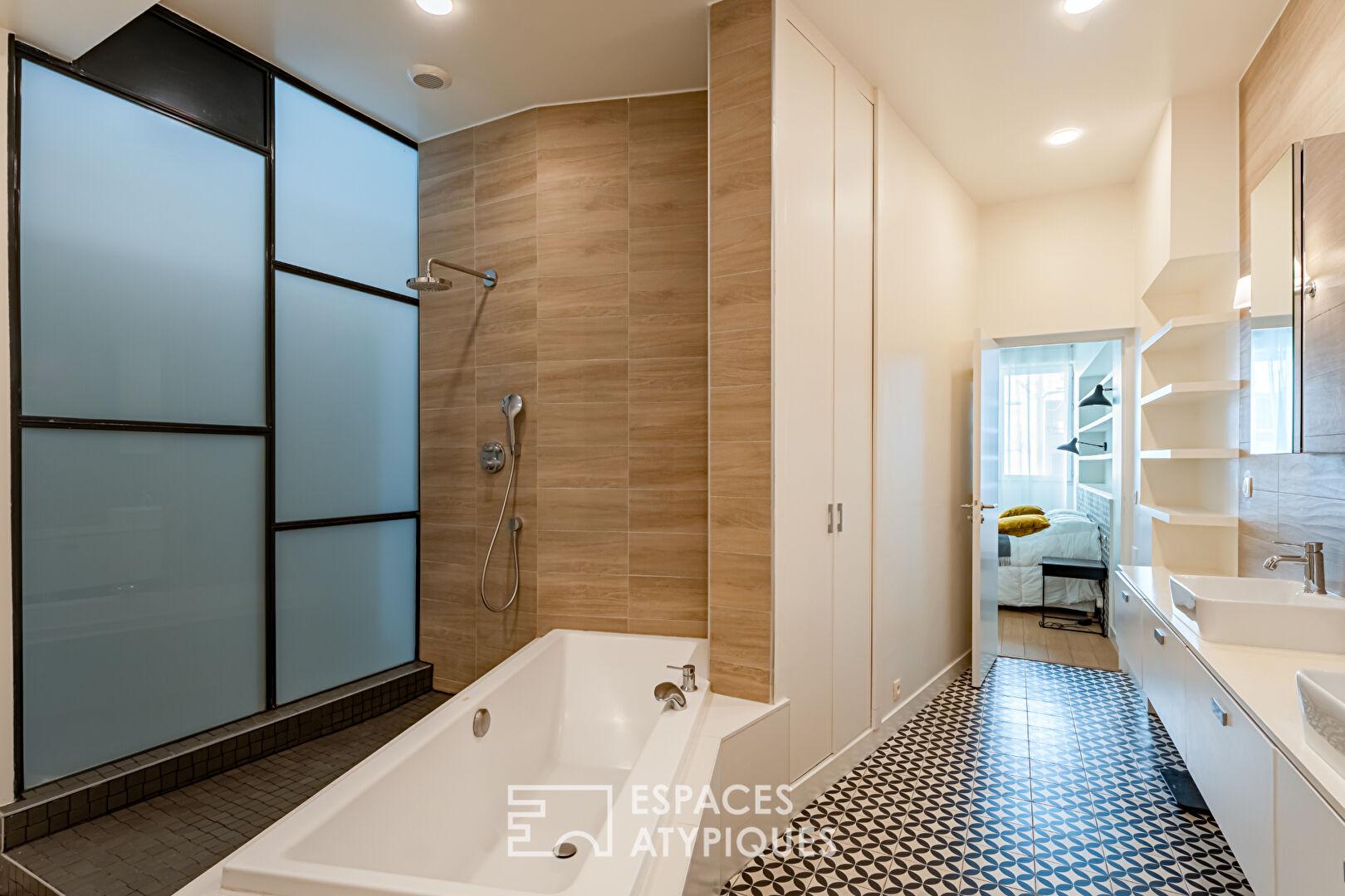 Dans son prolongement direct, une spectaculaire salle de bain privative vient parachever les prestations haut de gamme de cette suite. Son sol, paré de carreaux de ciment aux motifs graphiques et hypnotiques, crée un contraste saisissant avec les lignes contemporaines du meuble double vasque et la chaleur du grès cérame façon bois. Conçu comme un véritable espace de bien-être, ce lieu hybride réunit une baignoire propice à la détente et une grande douche à l’italienne, subtilement dissimulée derrière une paroi esprit verrière aux verres dépolis qui amène une belle luminosité.