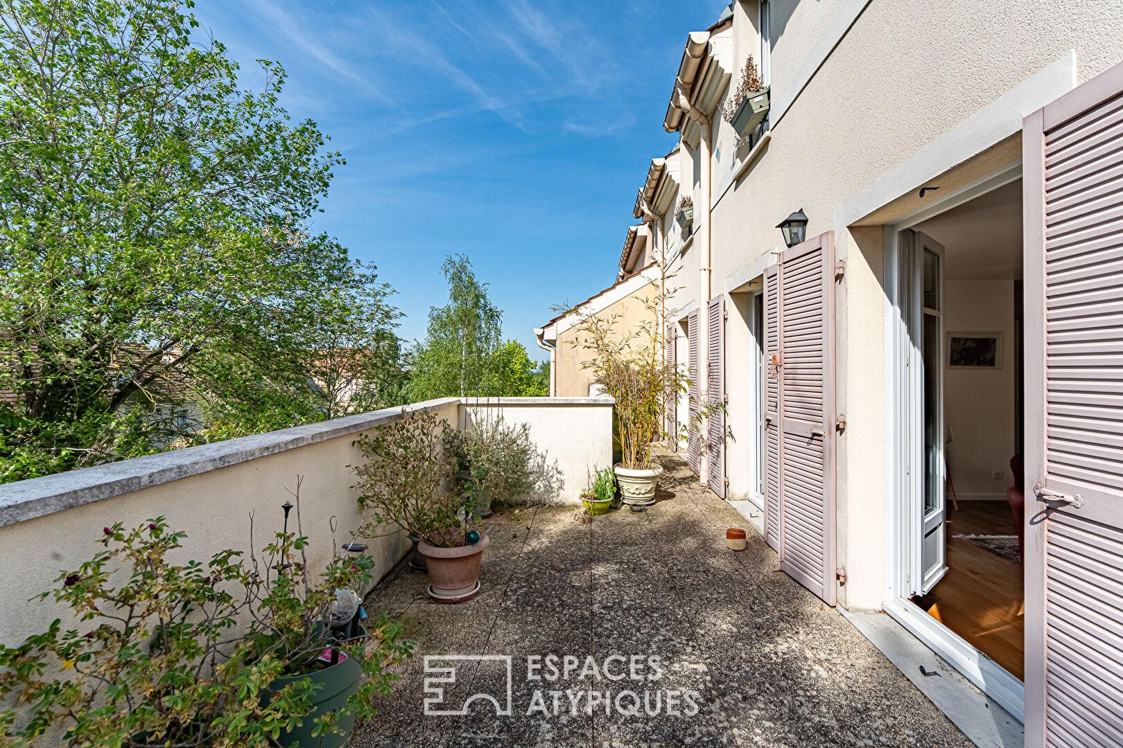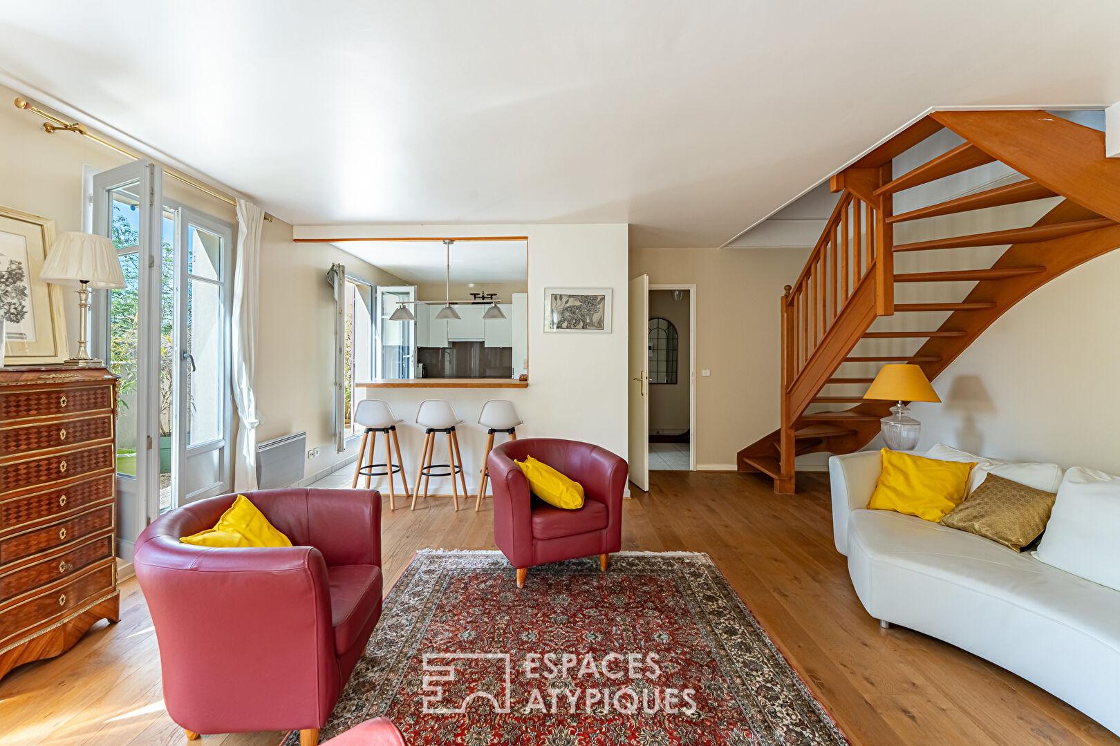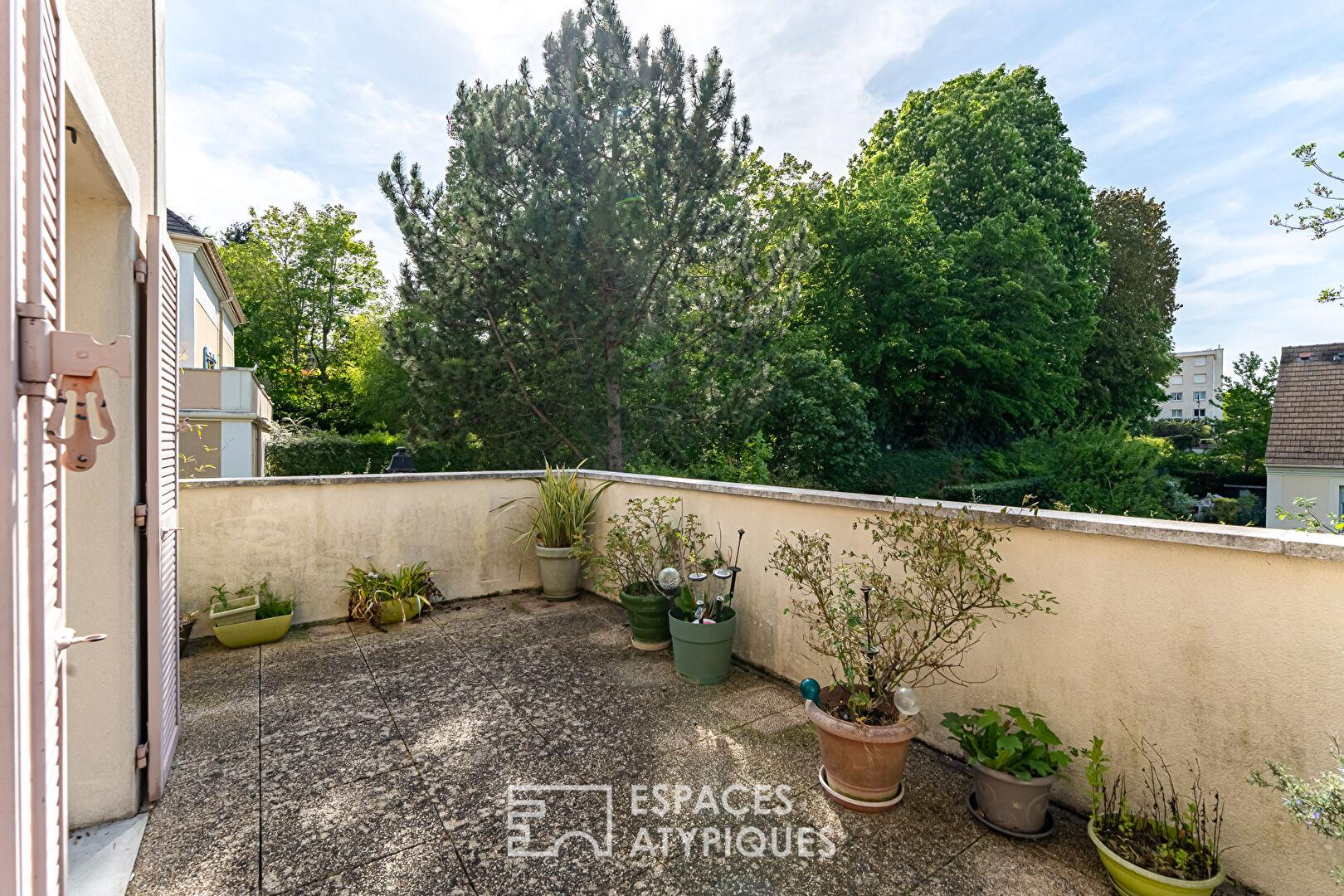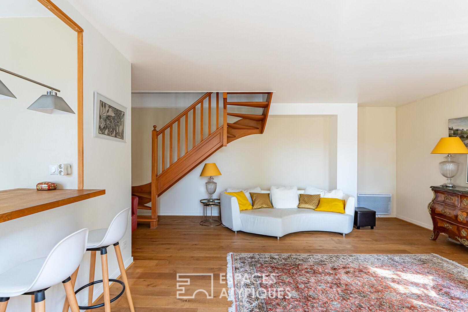 Ce duplex d’exception niché à Chambourcy, déploie une surface Carrez de 85,20 m². Cet appartement de quatre pièces se distingue par son architecture en duplex et sa belle terrasse privative de 26 m², offrant un cadre de vie agréable et privilégié. L’intérieur s’articule autour d’une pièce de vie lumineuse de 27 m² auxquels s’ajoutent les 9 m² de cuisine semi-ouverte, coeur battant de l’habitation, baignée d’une atmosphère chaleureuse. L’agencement intelligent sépare harmonieusement les espaces. l’étage supérieur est dédié au repos avec deux chambres qui se partagent une salle de bains et la troisième profite d’une salle d’eau privée. Cet agencement en duplex confère au lieu un cachet singulier, idéal pour une vie de famille moderne. À l’extérieur, la terrasse constitue un véritable prolongement des pièces de réception, invitant à la contemplation et à la détente en plein air. Situé dans un environnement calme et résidentiel, le bien bénéficie de la proximité immédiate des commodités de Chambourcy.