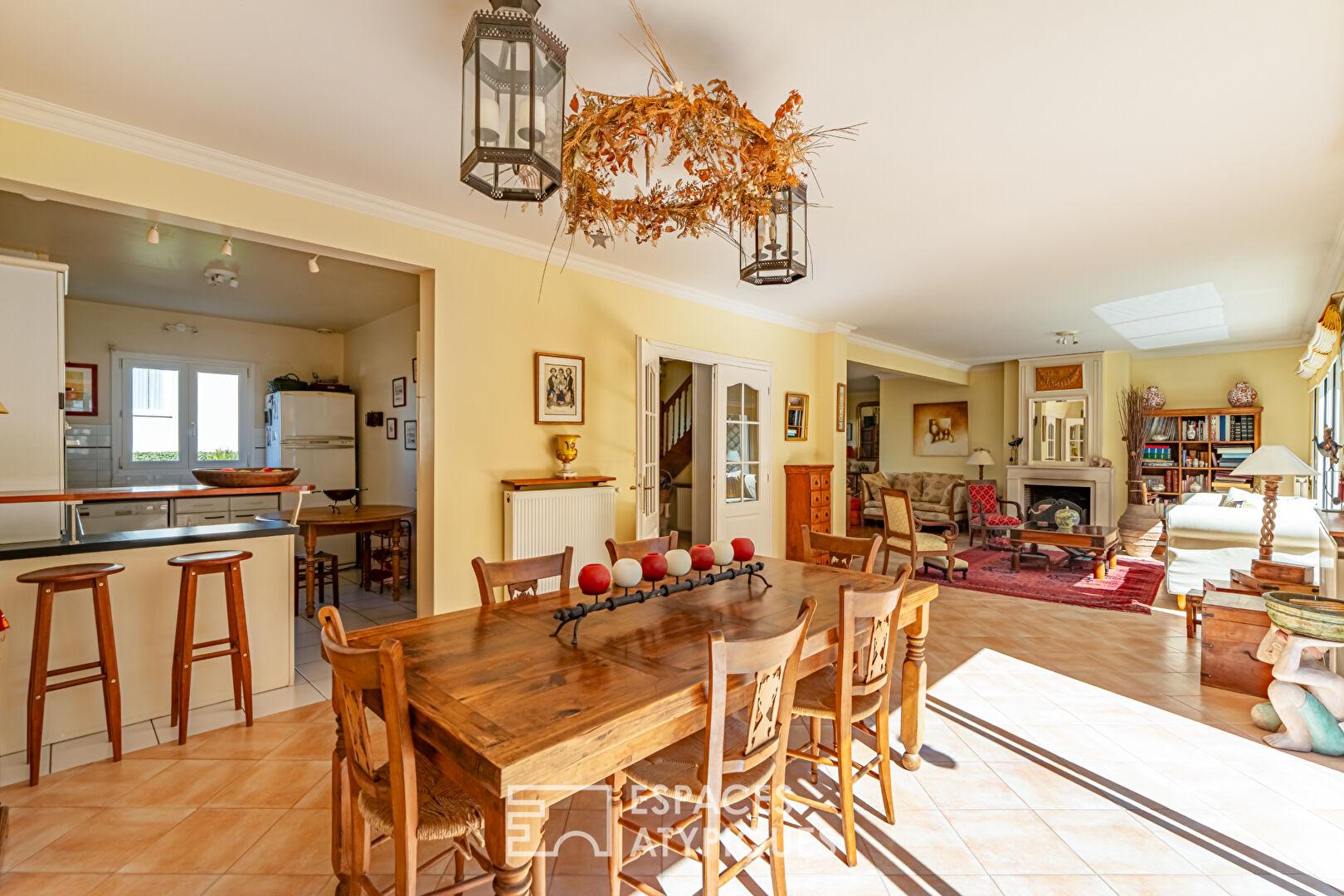 Après une volée de marches, l’entrée s’ouvre sur une pièce de réception lumineuse de 67 m². Cet espace de vie comprend une salle à manger offrant une vue dégagée sur le jardin, la terrasse et sa piscine (5×2,50 m) ainsi qu’un double séjour traversant agrémenté d’une cheminée. Une cuisine semi-ouverte complète ce bel ensemble.
