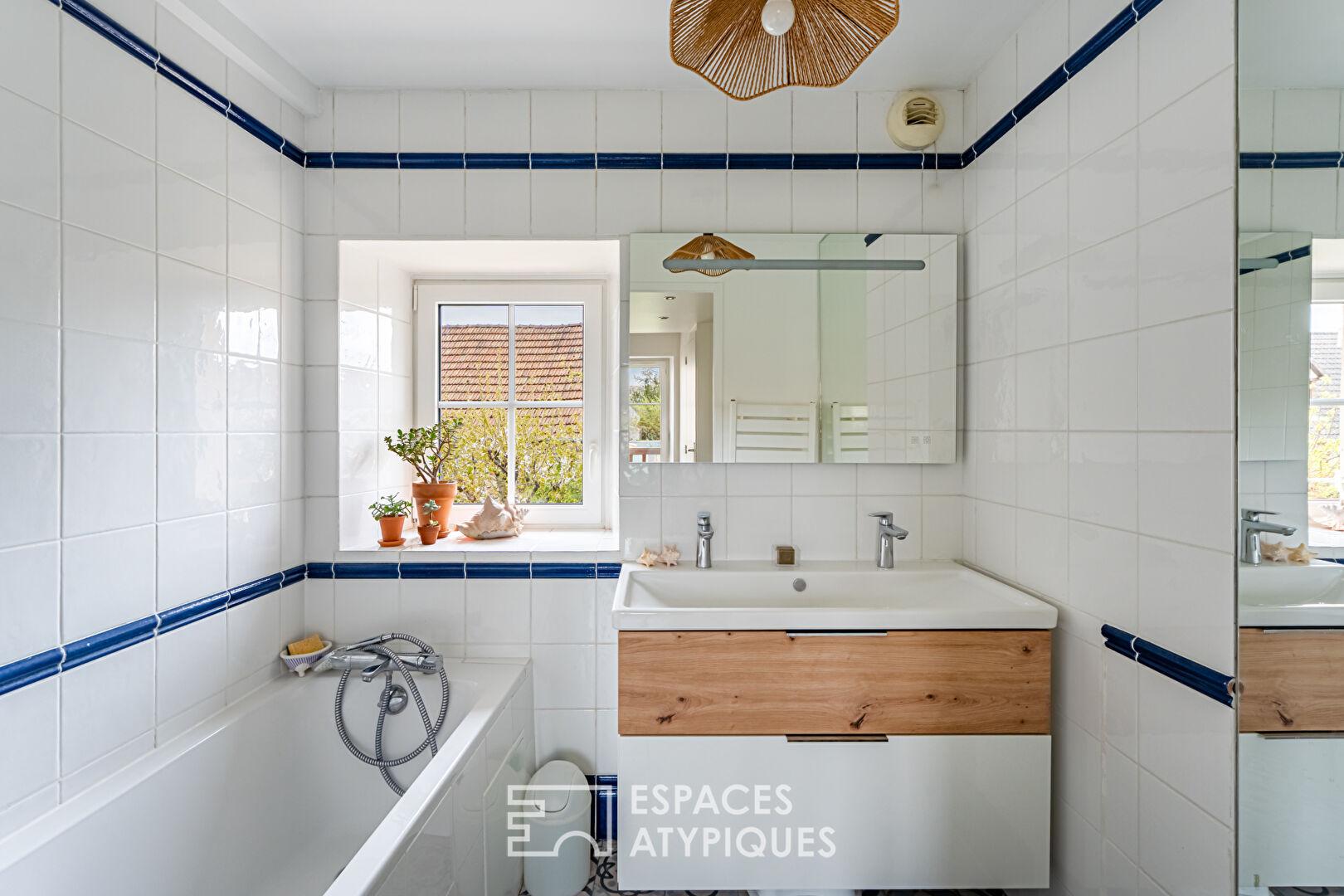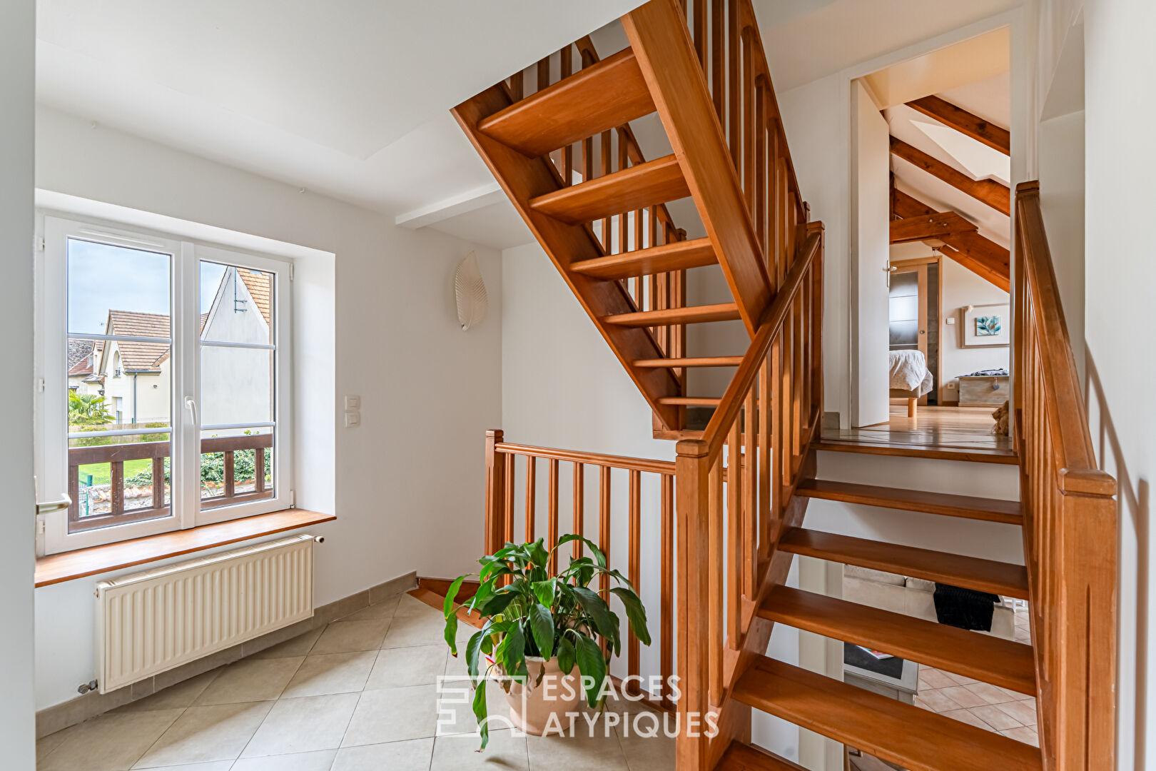 Les extérieurs offrent un jardin plat, arboré et fleuri, sans vis-à-vis, un stationnement pour deux véhicules, un local technique ainsi qu’un garage de 15 m² avec porte automatisée (possibilité d’installer une borne électrique).