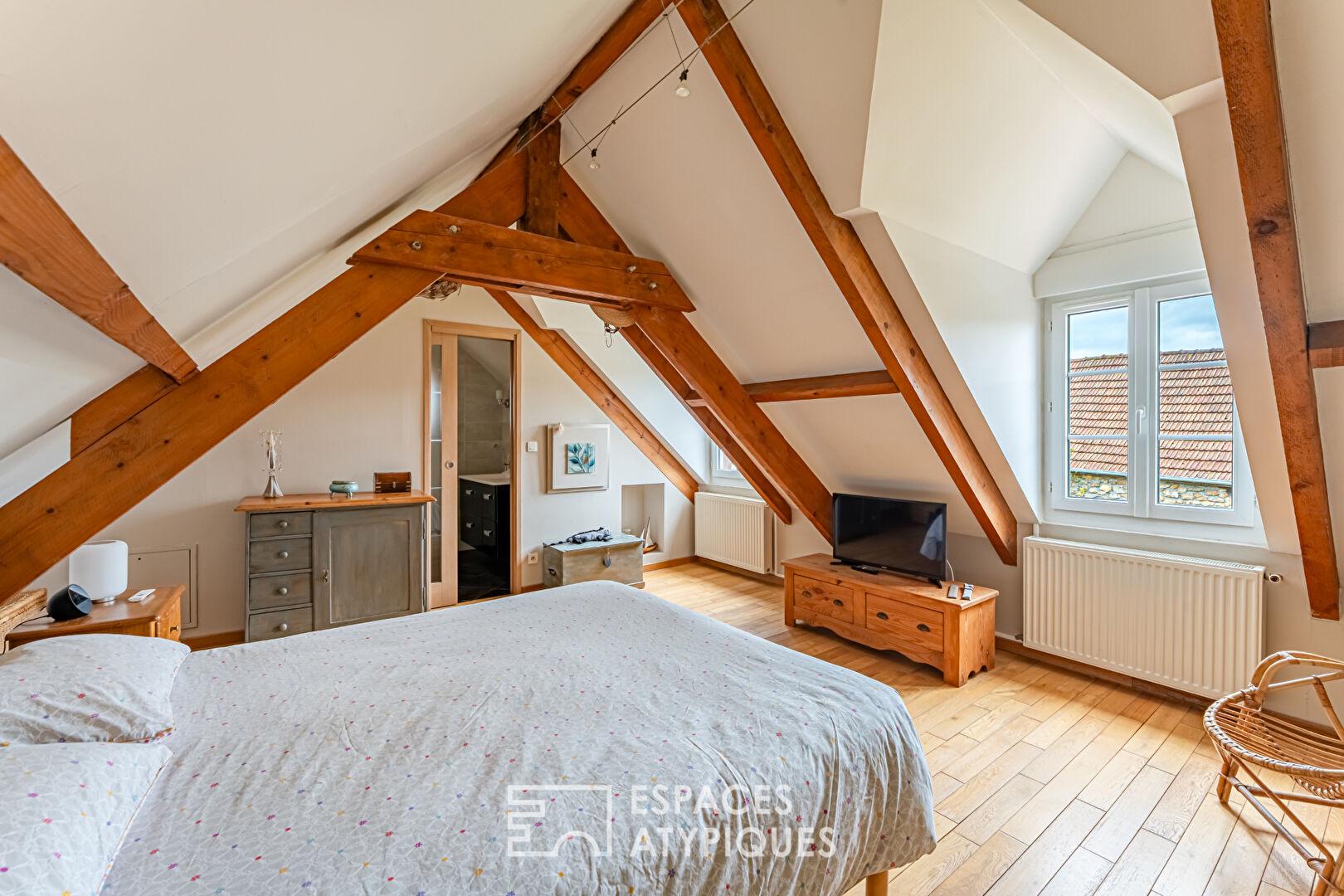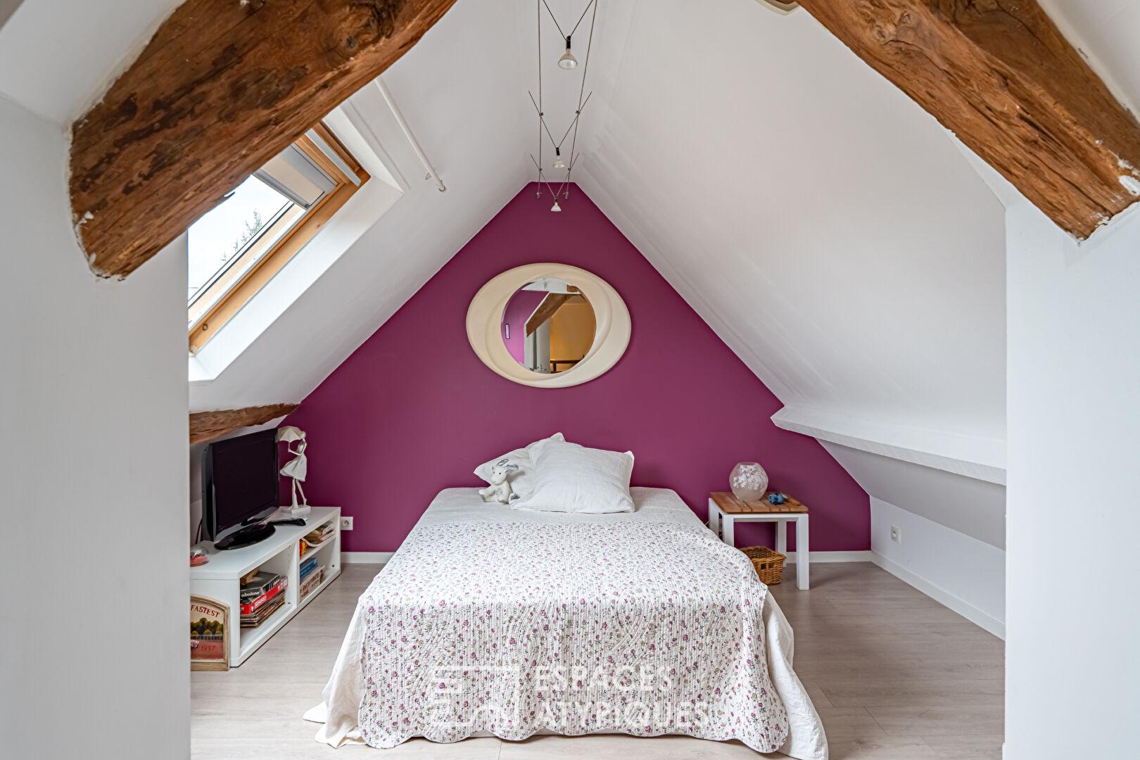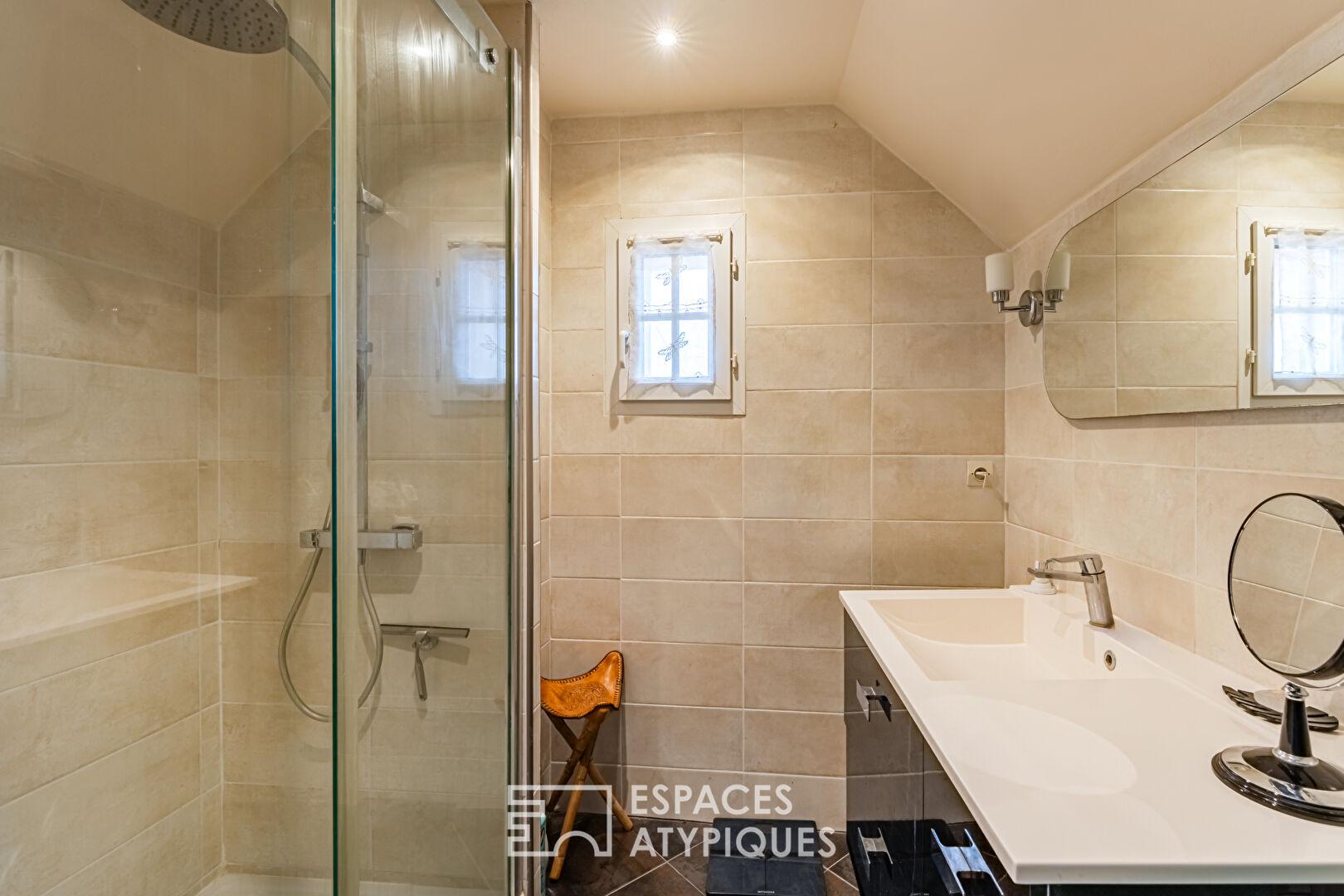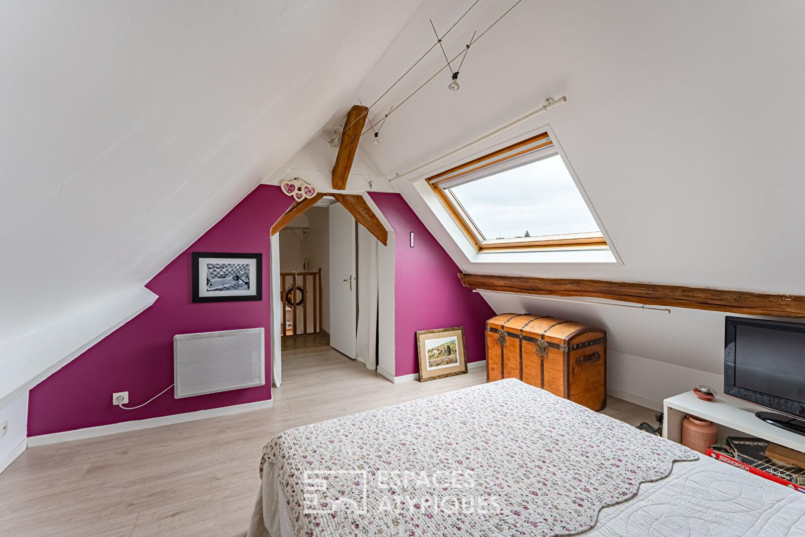 Au premier étage, deux chambres avec placards se partagent une salle de bains moderne, ainsi qu’une suite parentale avec charpente apparente et sa salle d’eau à l’italienne attenante. Au dernier étage, sous mansarde, se trouvent une quatrième chambre et une pièce de stockage.