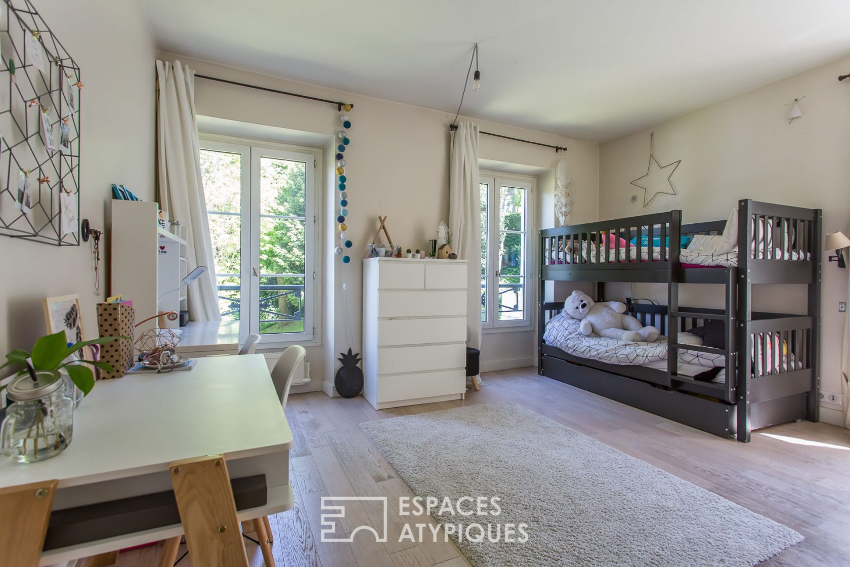 Ce très beau duplex de 145 m² occupe l’aile gauche d’un magnifique petit château Napoléon III sur un parc arboré de 3 500 m², il est situé à Bougival très proche de Rueil-Malmaison.