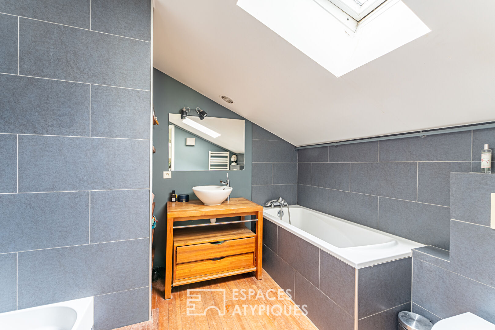L’entrée avec vestiaire s’ouvre sur une cuisine équipée installée sous une verrière, baignée de lumière naturelle.