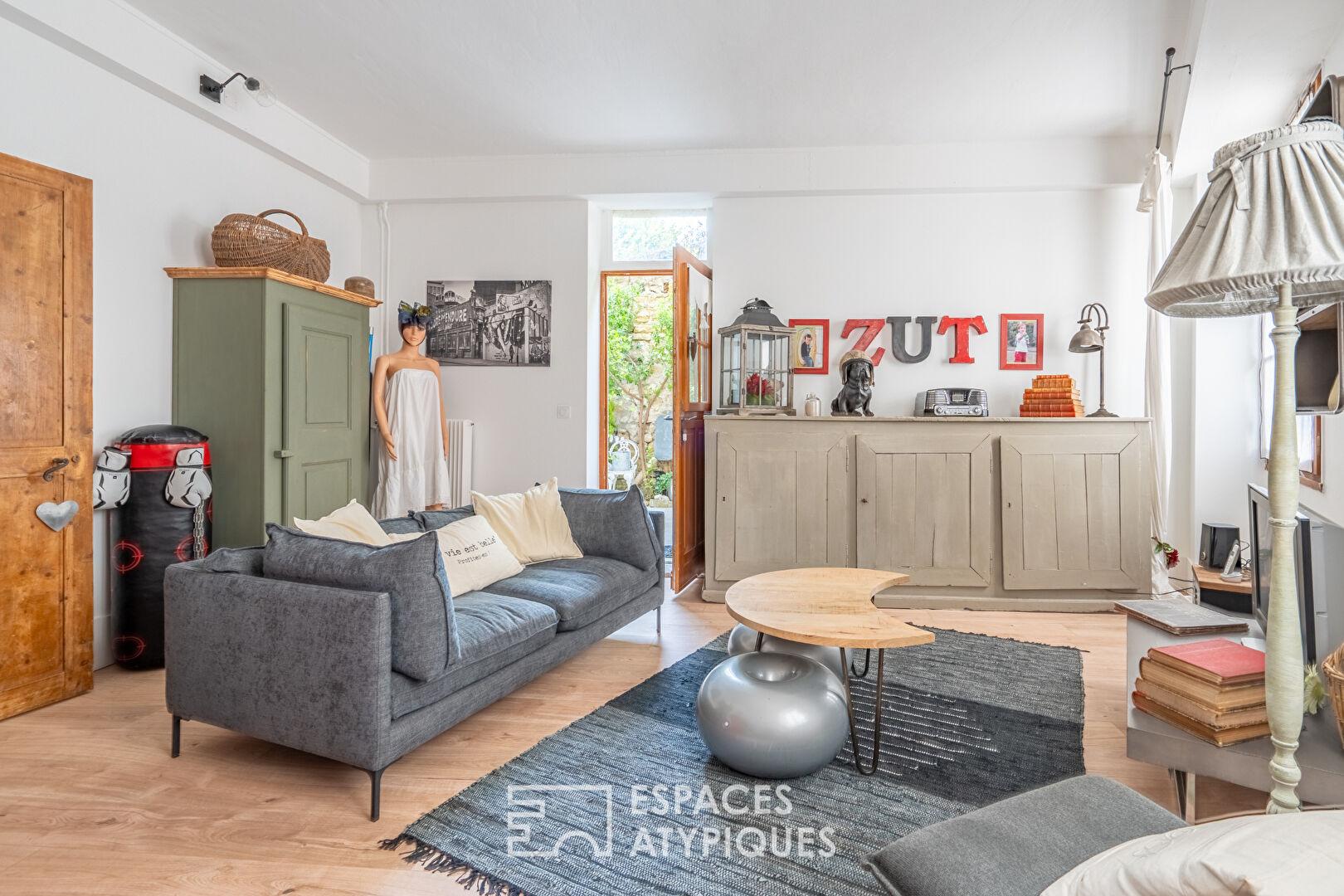 L’entrée s’ouvre sur un dégagement qui dessert, un salon d’été tourné sur la jolie cour intérieure de 34 m² agréablement aménagée, une chambre de 10 m² avec un généreux dressing et sa salle d’eau/buanderie.