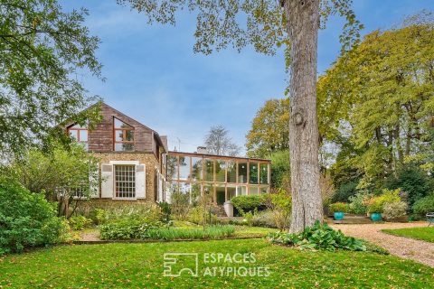 Au coeur de l’agréable commune d’Orgeval, cet ancien relais de chasse a su traverser les époques en maintenant ses traits anciens avec un parfait mélange de contemporain avec son extension en bardage bois, ou sa longue façade vitrée qui a su joliment déployer ses volumes, et offrir une belle avancée sur le jardin de 3.000 m².