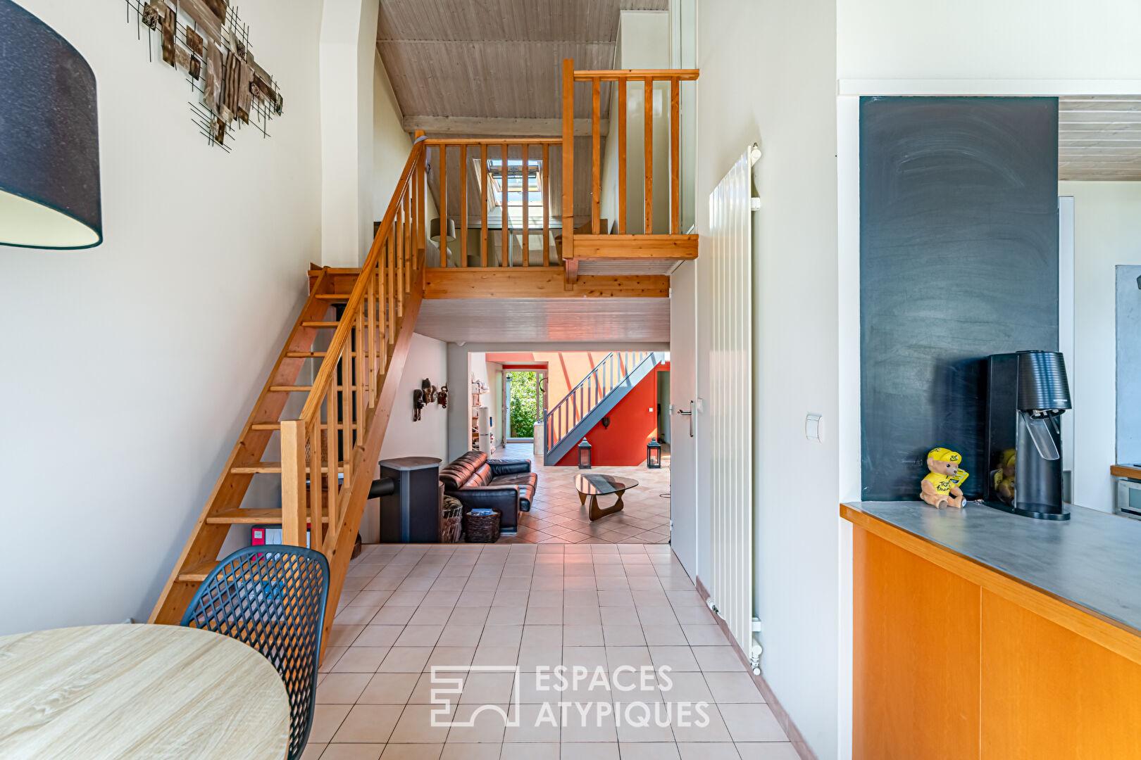 L’espace de vie s’organise sur plusieurs niveaux, favorisant une circulation fluide et une luminosité naturelle. Le rez-de-chaussée s’ouvre sur une entrée permettant d’accéder via un escalier à un niveau qui accueille un palier et une chambre, véritable refuge sous les toits avec sa salle d’eau . Cette entrée mène également vers une salle à manger et un séjour très chaleureux, sublimé par un poêle à bois, et une cuisine fonctionnelle. Une salle de fitness transformable en chambre avec un balcon et accès jardin complète ce niveau . Un escalier mène au premier étage vers une autre chambre et une salle d’eau. Le sous-sol total, abritant garage ,buanderie et un atelier avec un accès jardin apporte une dimension pratique indispensable à cette maison de caractère.