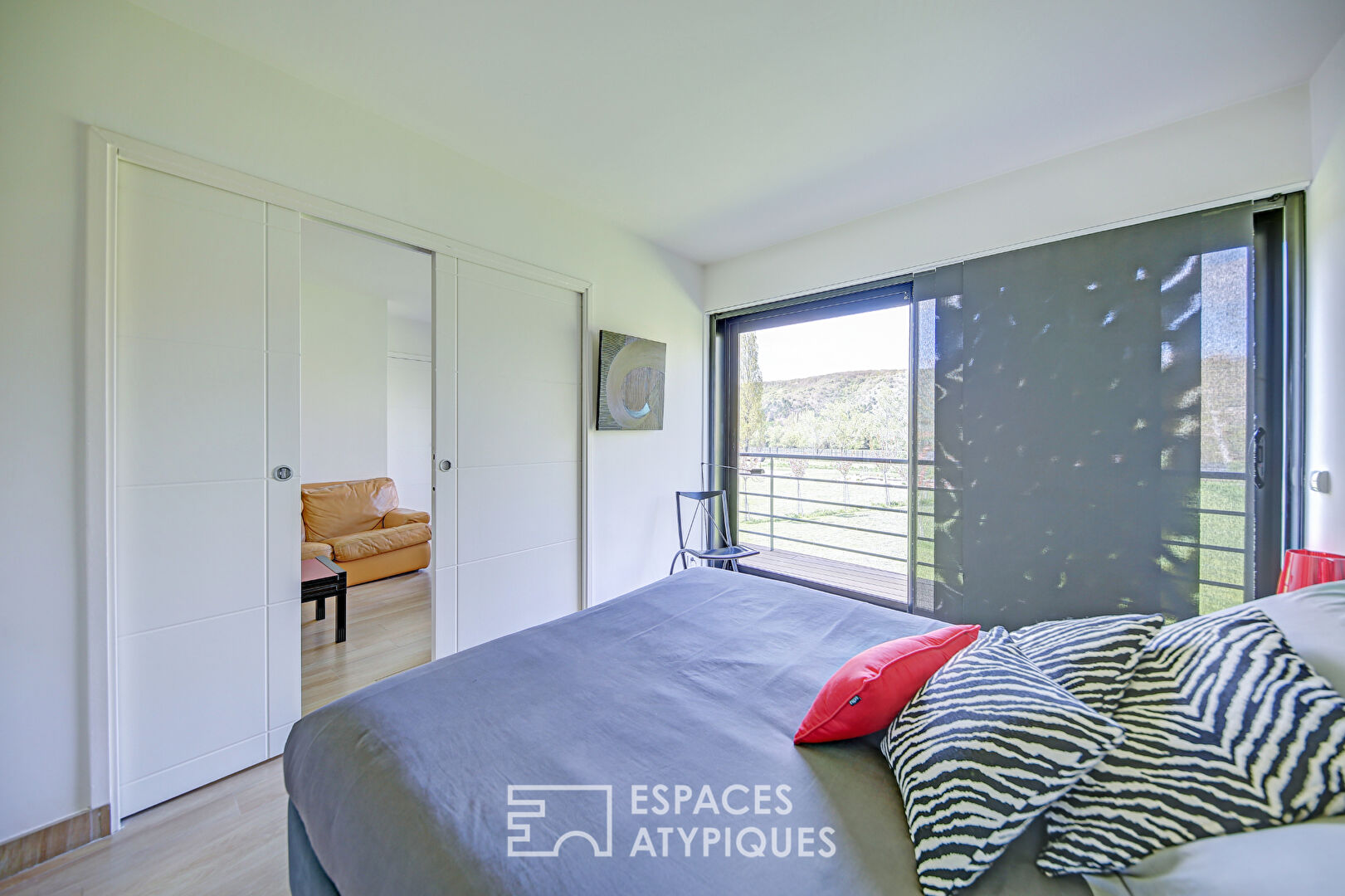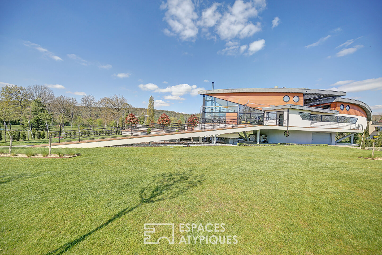 Au coeur des Boucles de Seine et de ses typiques falaises de calcaire, cette maison d’architecte est en symbiose avec le paysage fluvial et ses bateaux qui longent la propriété.