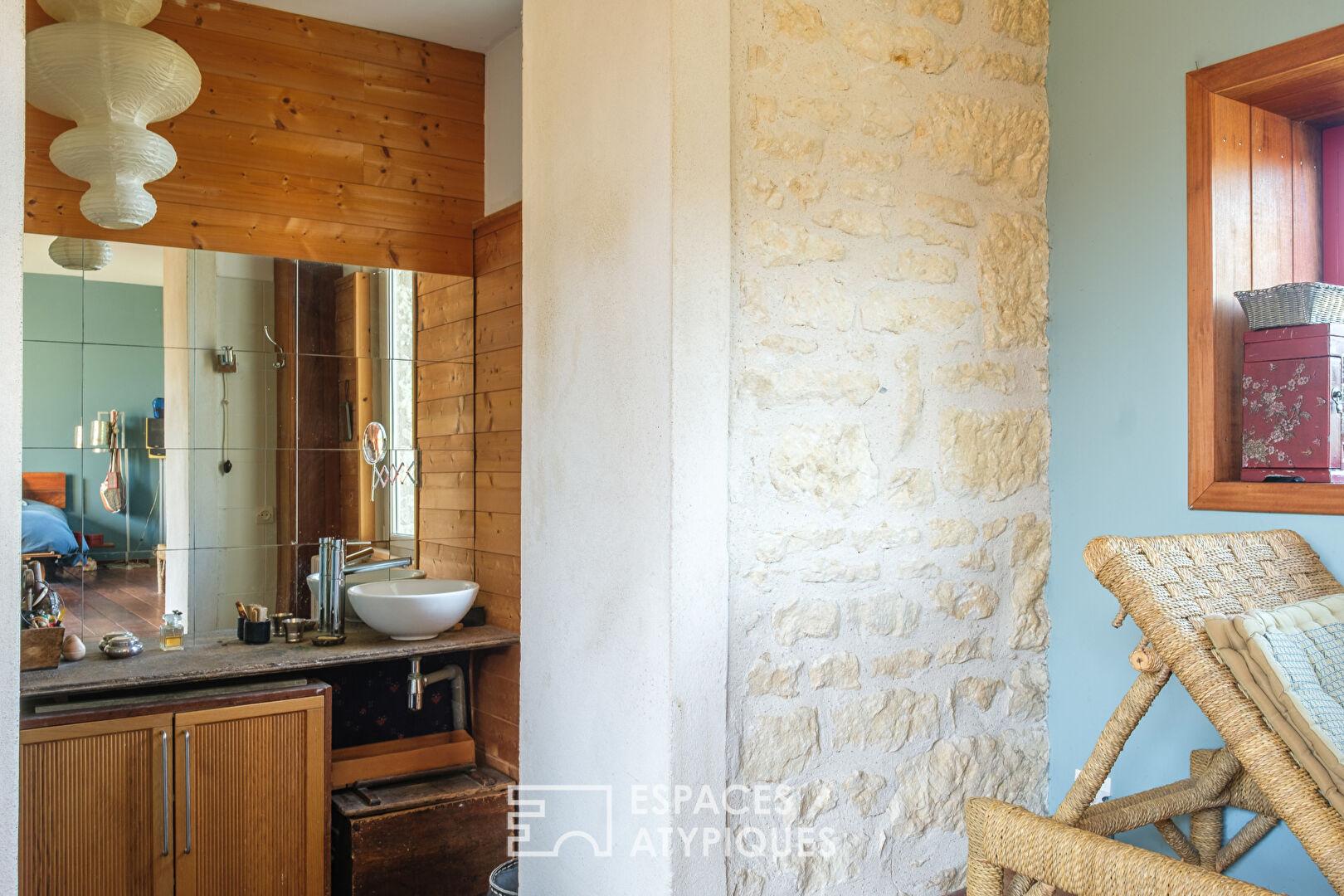 L’ascension au premier étage révèle un espace nuit composé de deux chambres aux dimensions confortables. Ce niveau est sublimé par une suite parentale résolument atypique, conçue comme une boîte en bois contemporaine posée sur l’existant. Cette prouesse architecturale abrite une salle d’eau et s’ouvre sur une terrasse suspendue et intimiste. Le dernier étage complète la capacité d’accueil de la bâtisse avec deux chambres supplémentaires et une vaste salle de bains familiale.