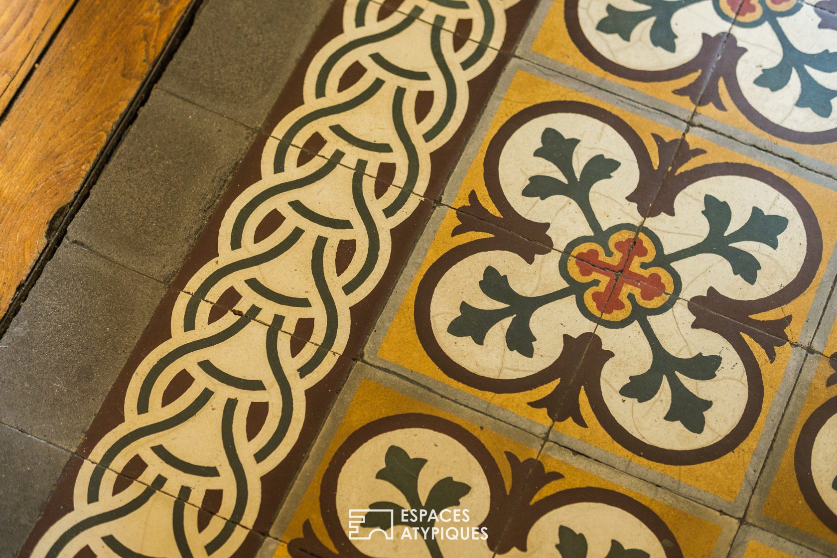 Dès l’entrée, le ton est donné par les carreaux de ciment d’époque qui guident le visiteur vers les pièces de réception. Le rez-de-chaussée s’articule autour d’un salon et d’un séjour, où parquets massifs, belles hauteurs sous plafond, moulures et cheminées confèrent une atmosphère noble et chaleureuse.