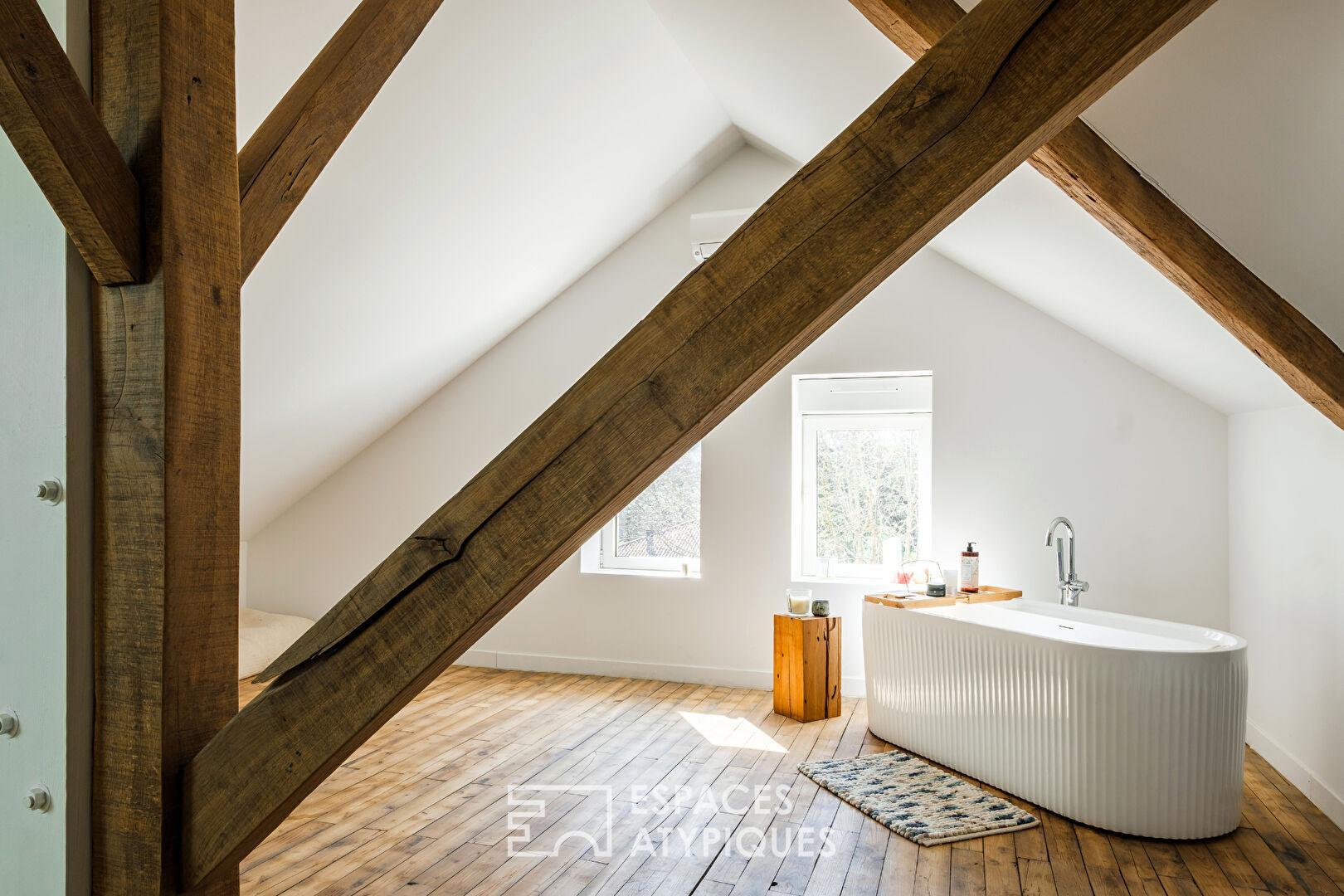 Niché sous la majestueuse charpente apparente du dernier étage, l’espace révèle une chambre de maître, véritable cocon douillet sublimé par une baignoire îlot.