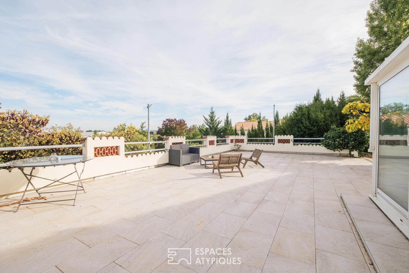 Le jardin et sa vaste terrasse exposée sud-ouest constitue un véritable lieu de vie extérieur à part entière aux beaux jours, dévoilant un panorama apaisant sur la Sèvre. L’atmosphère qui règne allie la quiétude d’un environnement verdoyant à la proximité immédiate de l’hyper-centre de Niort, de ses commerces, de ses transports et de ses écoles.