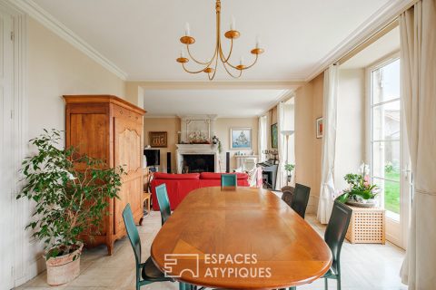 Le rez-de-chaussée dévoile une grande pièce de vie baignée de lumière, sublimée par une majestueuse cheminée en pierre d’époque, qui invite à de douces soirées au coin du feu et offre à la pièce une ambiance conviviale et authentique. Une cuisine indépendante ainsi qu’un bureau transformable en chambre complètent ce niveau.