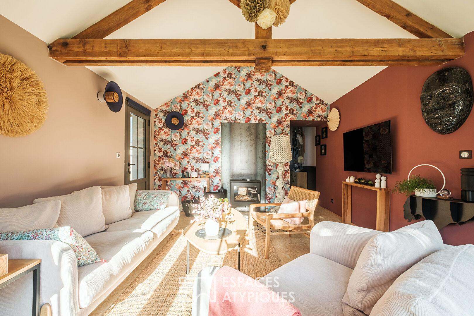 La pièce de vie s’organise autour d’une cuisine contemporaine, sublimée par une spectaculaire baie accordéon qui efface la frontière entre intérieur et extérieur. Le plan de travail, pensé dans les moindres centimètres, devient un espace de partage, baigné de lumière naturelle. Les jeux de plafonniers viennent parfaire l’ambiance, offrant une atmosphère chaleureuse et conviviale à toute heure. Dans le prolongement, un espace de type véranda agit comme un sas, une respiration. Le salon, organisé autour d’un poêle à bois, devient un refuge propice à la lecture et aux instants suspendus.