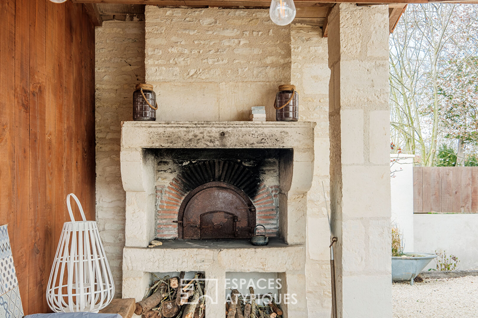 Dans le prolongement de la maison, un préau accueille un four à pain et un espace grillade, de quoi prolonger avec envie les soirées estivales.