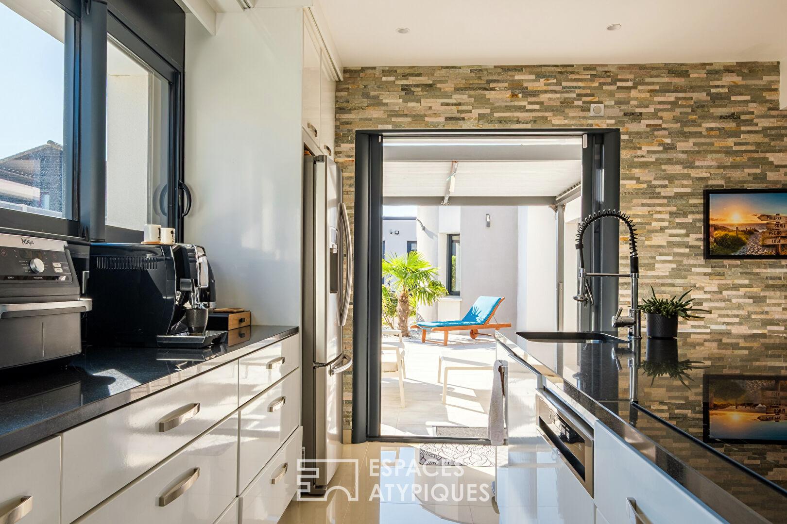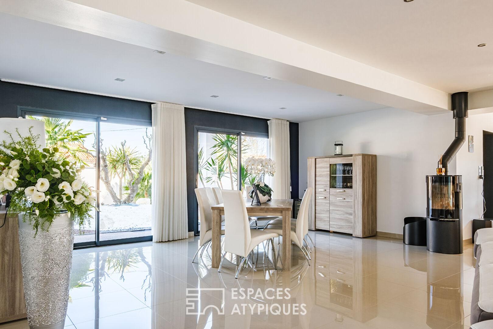 Dès l’arrivée, les extérieurs aux accents méditerranéens installent une atmosphère douce et dépaysante. Les lignes de la maison se découvrent progressivement, laissant présager des volumes généreux pensés pour le partage et les moments de vie.