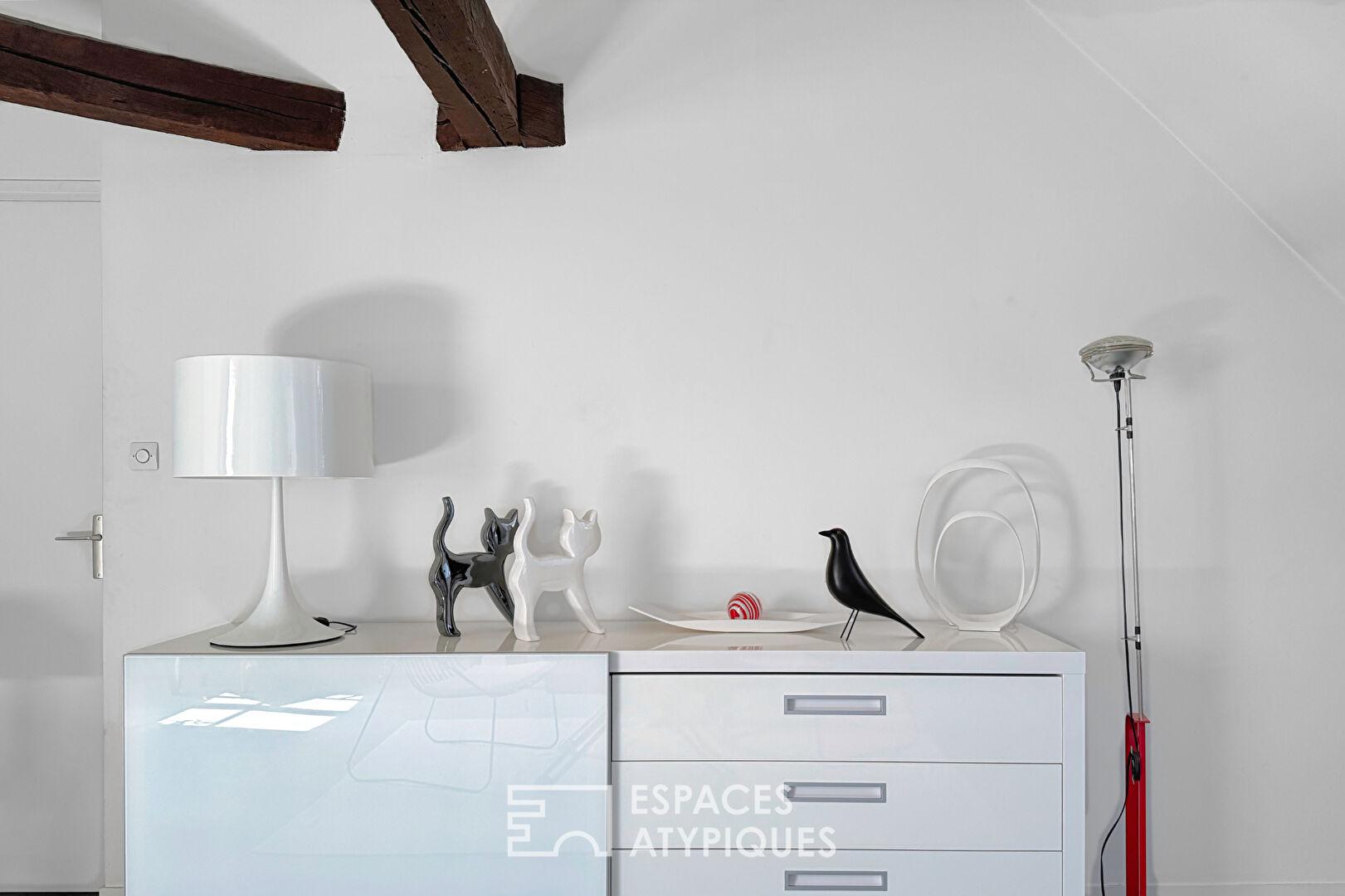 Sous les toits, la pièce de vie baignée de lumière offre de beaux volumes mis en valeur par une charpente apparente au cachet remarquable. L’ensemble dégage une ambiance chaleureuse et propice à l’inspiration.