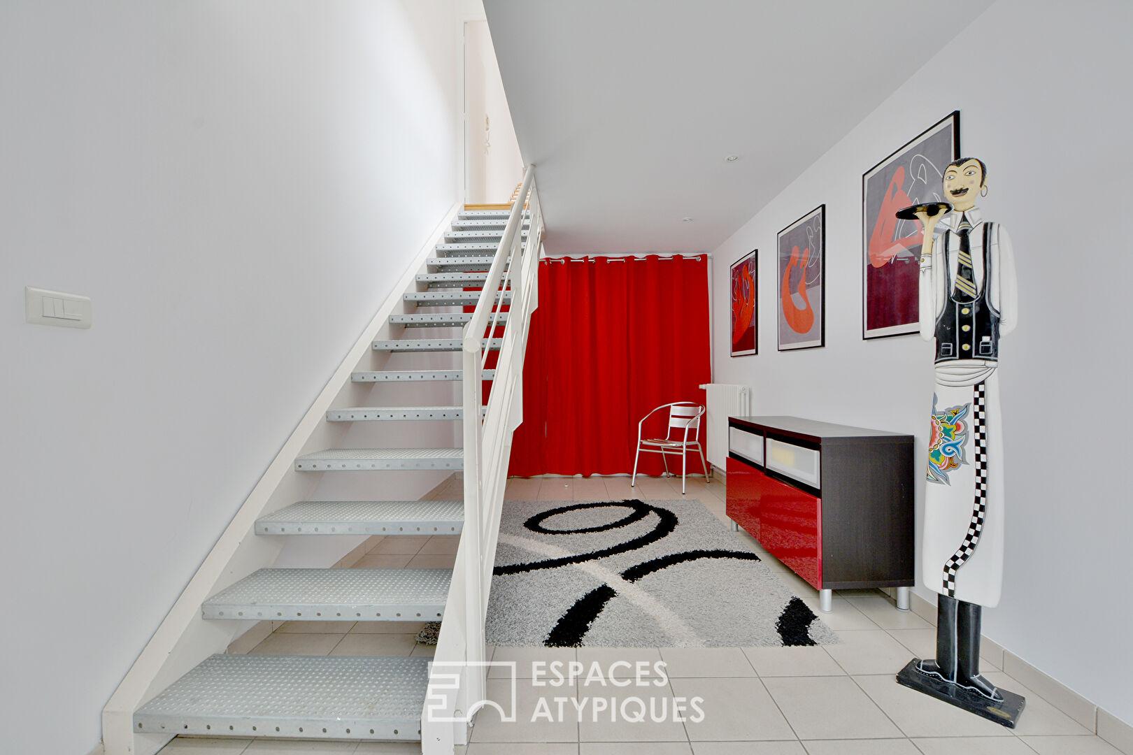 Les lignes architecturales s’y affirment avec caractère, portées par un escalier au dessin remarquable, clin d’oeil assumé au passé industriel du lieu.