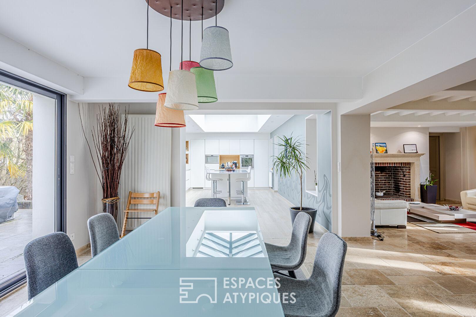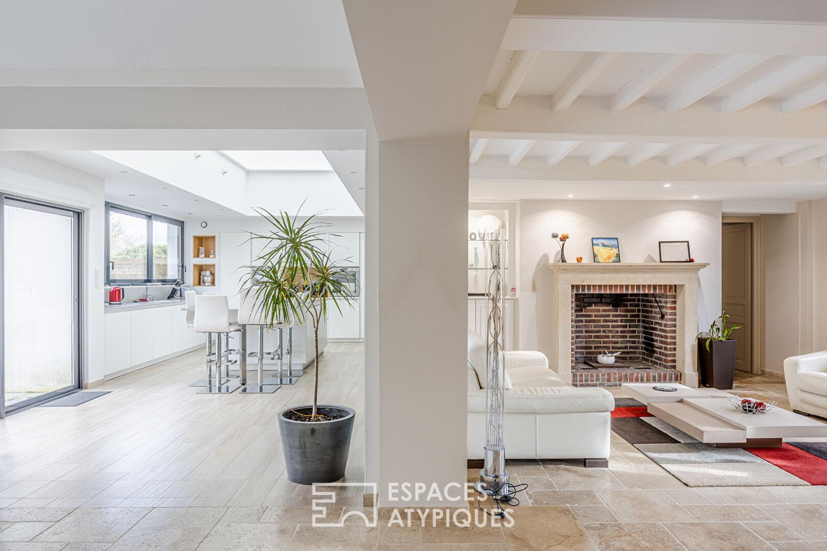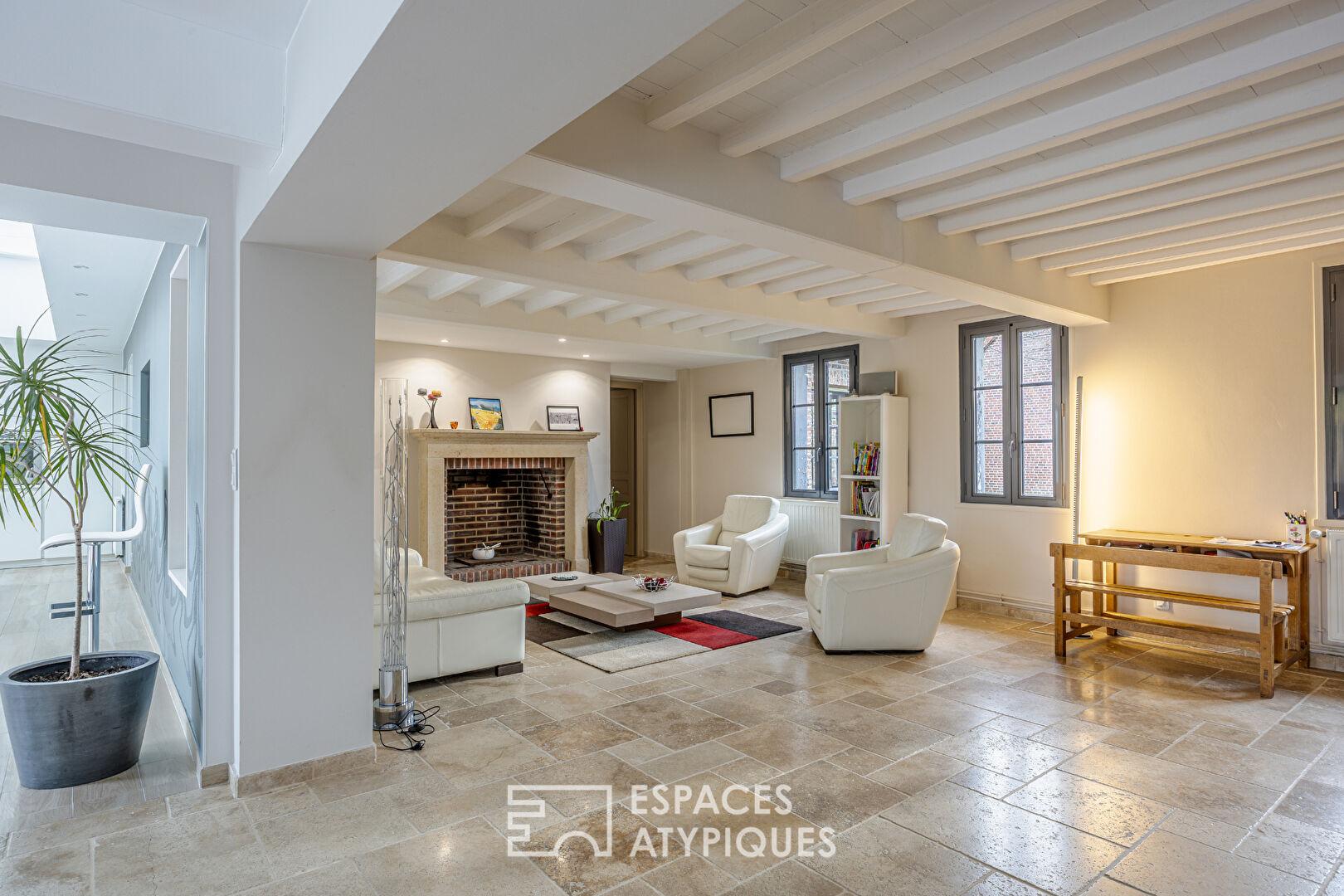 À l’ombre du Château de Querrieu, cette magnifique longère mêle avec audace, authenticité rurale et codes architecturaux contemporains. Entre poutres, charpente apparente et larges ouvertures vitrées, cette belle maison offre un dialogue permanent entre intérieur et extérieur.