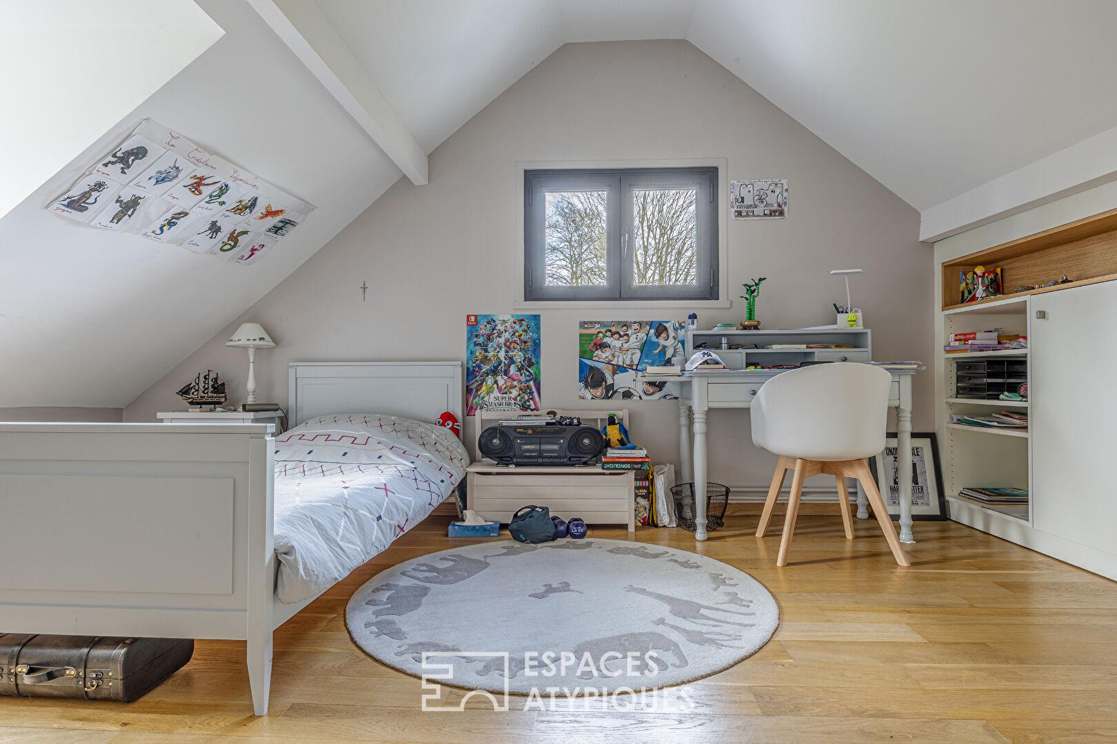 Le rez-de-chaussée propose une vie autonome avec une suite parentale et sa salle de bains privée. Un bureau bénéficiant d’un accès indépendant permet d’isoler parfaitement une activité professionnelle du quotidien familial.