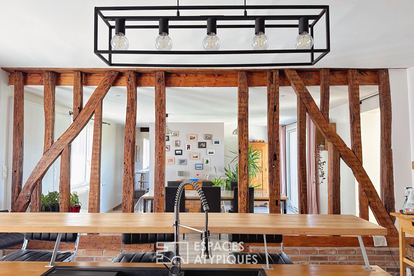 À l’intérieur, les volumes s’ouvrent avec générosité. Les pièces de vie profitent d’une belle luminosité et s’appuient sur des matériaux authentiques, où les poutres apparentes rythment les perspectives.