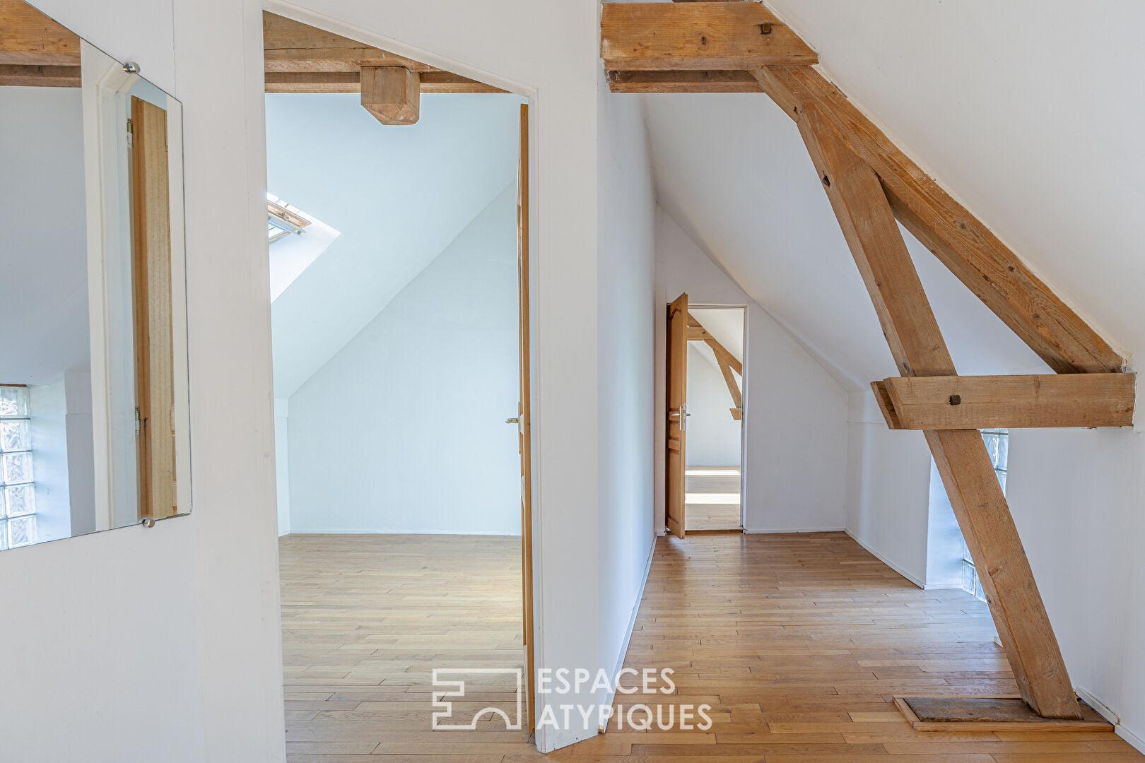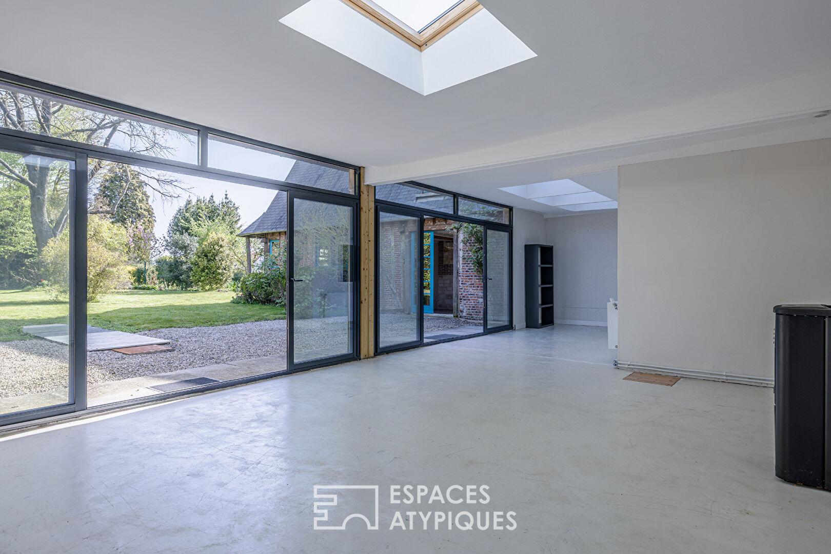 L’architecture intérieure joue sur la verticalité avec des mezzanines et des escaliers qui desservent des espaces aux volumes généreux. Une extension baignée de lumière vient rompre la linéarité classique pour offrir une clarté exceptionnelle, abolissant la frontière avec le jardin.
