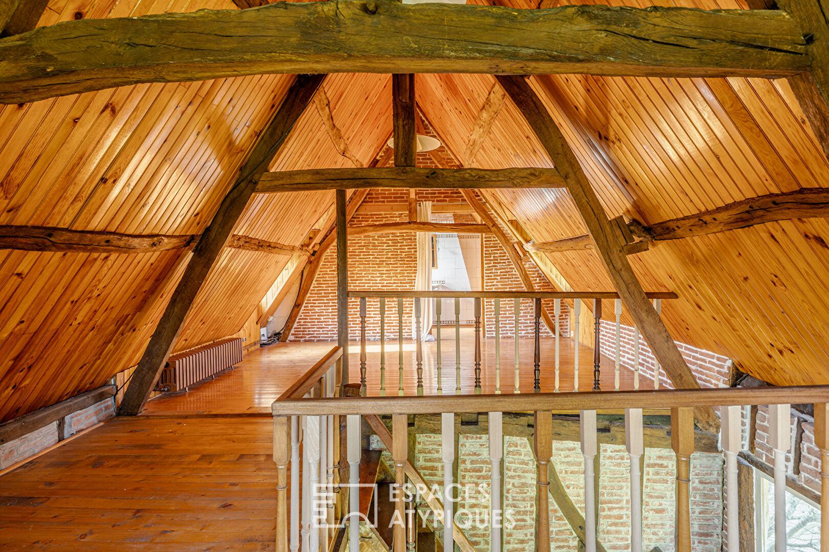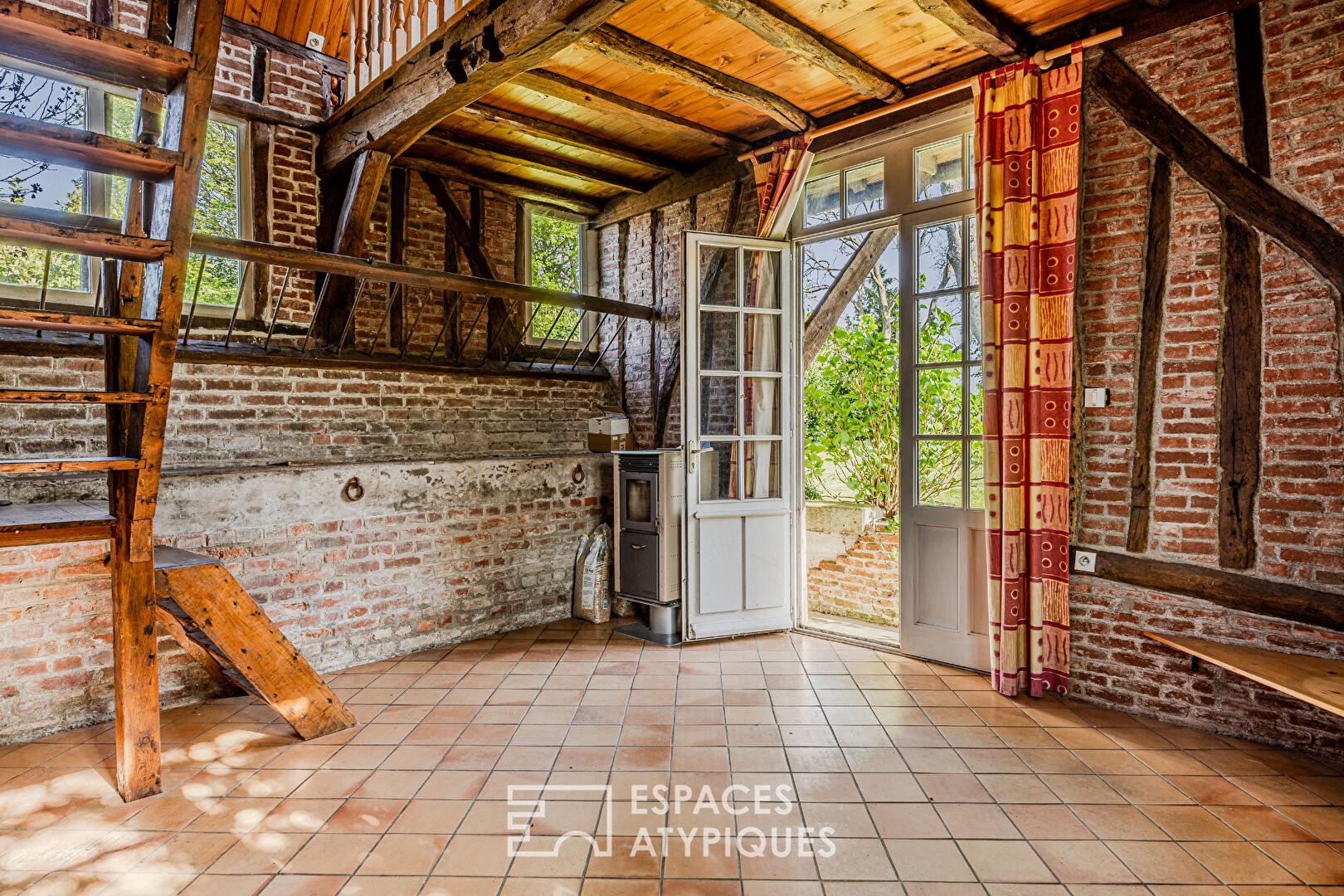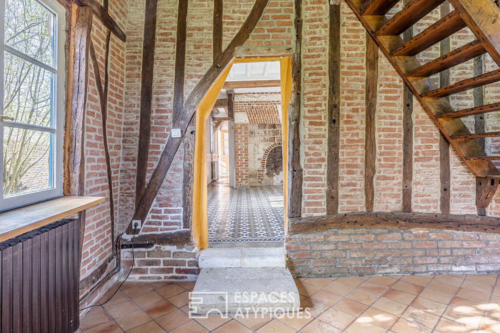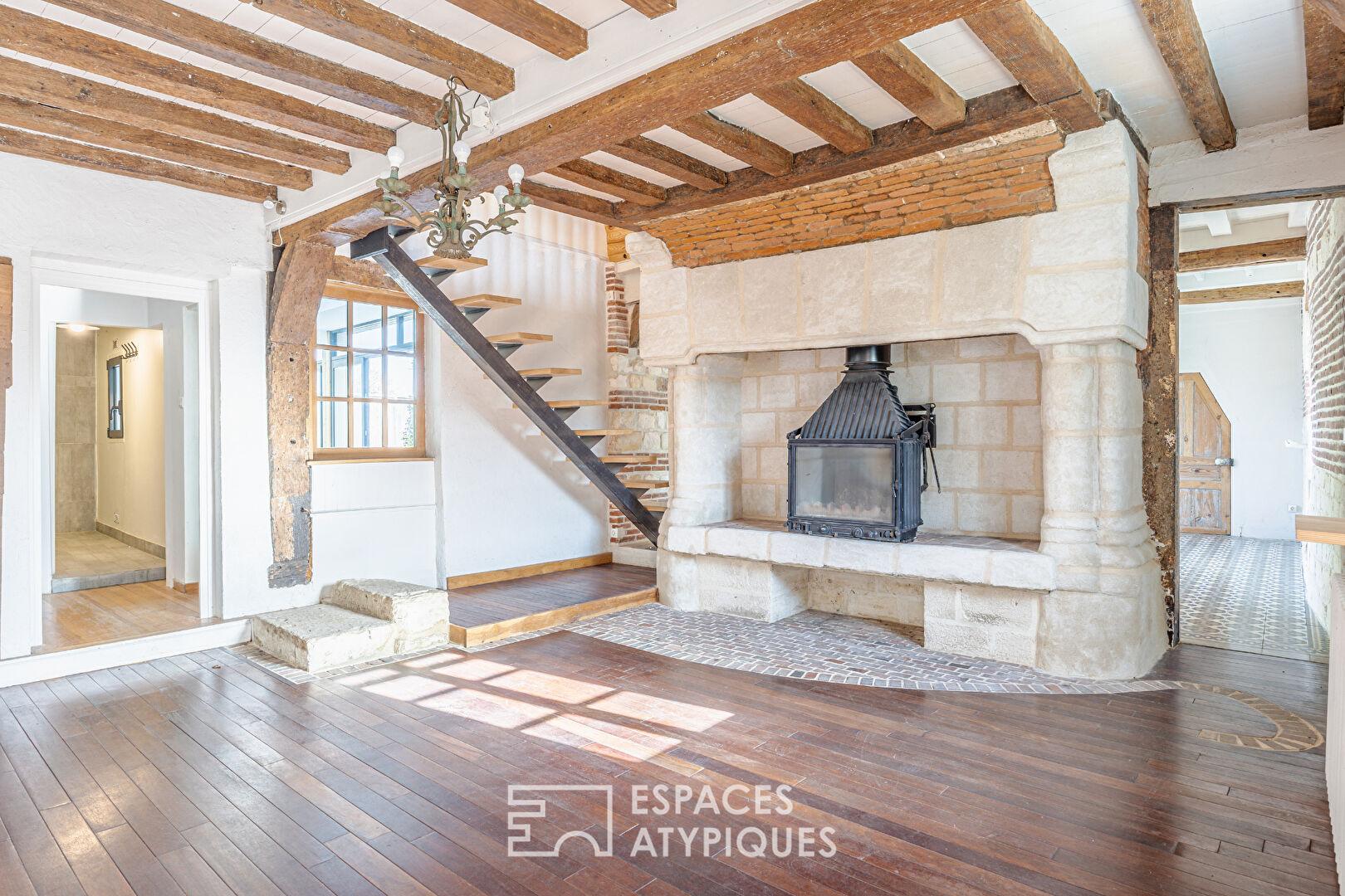 Dès l’entrée, le ton est donné. La structure à colombages et les briques rouges typiques s’habillent de volets d’un bleu profond, sous une toiture à l’exécution remarquable. À l’intérieur, c’est un voyage sensoriel : la chaleur des tomettes anciennes, les poutres apparentes, le bois, les carreaux de ciment et l’authenticité des cheminées créent une atmosphère enveloppante.