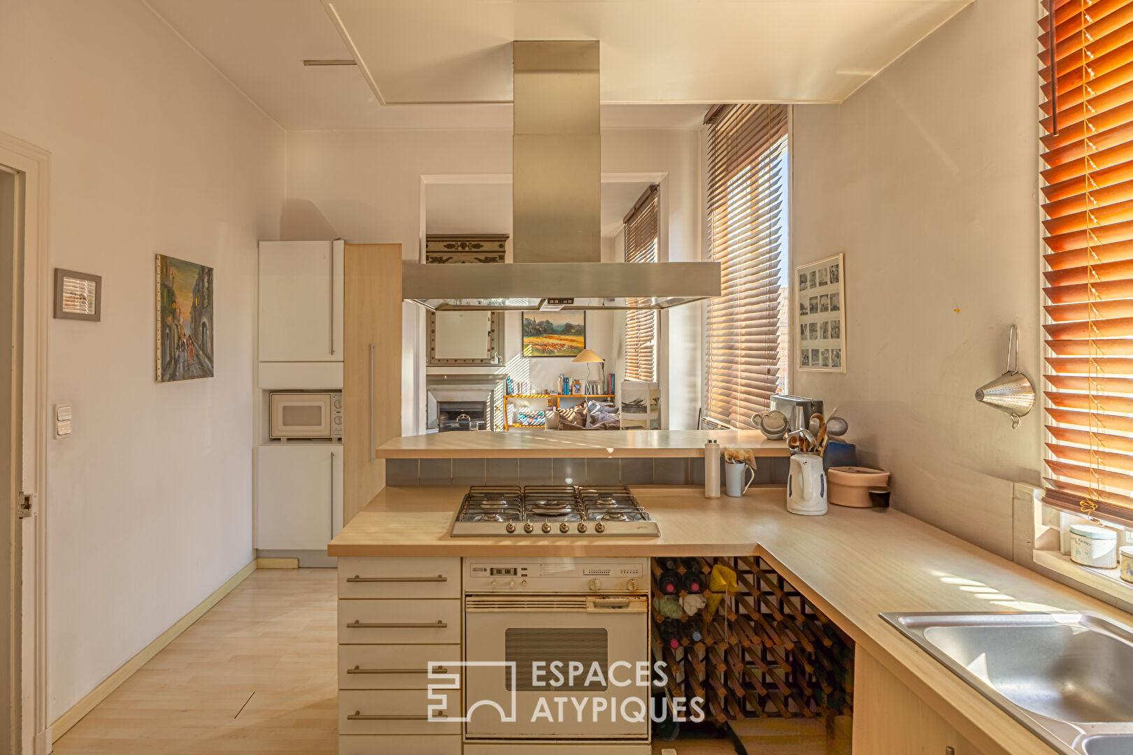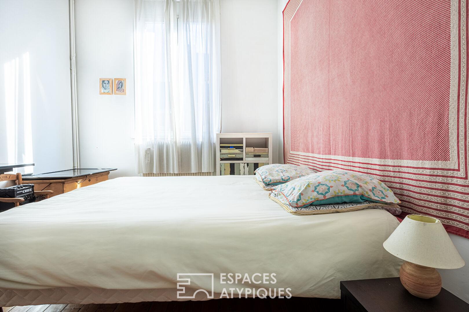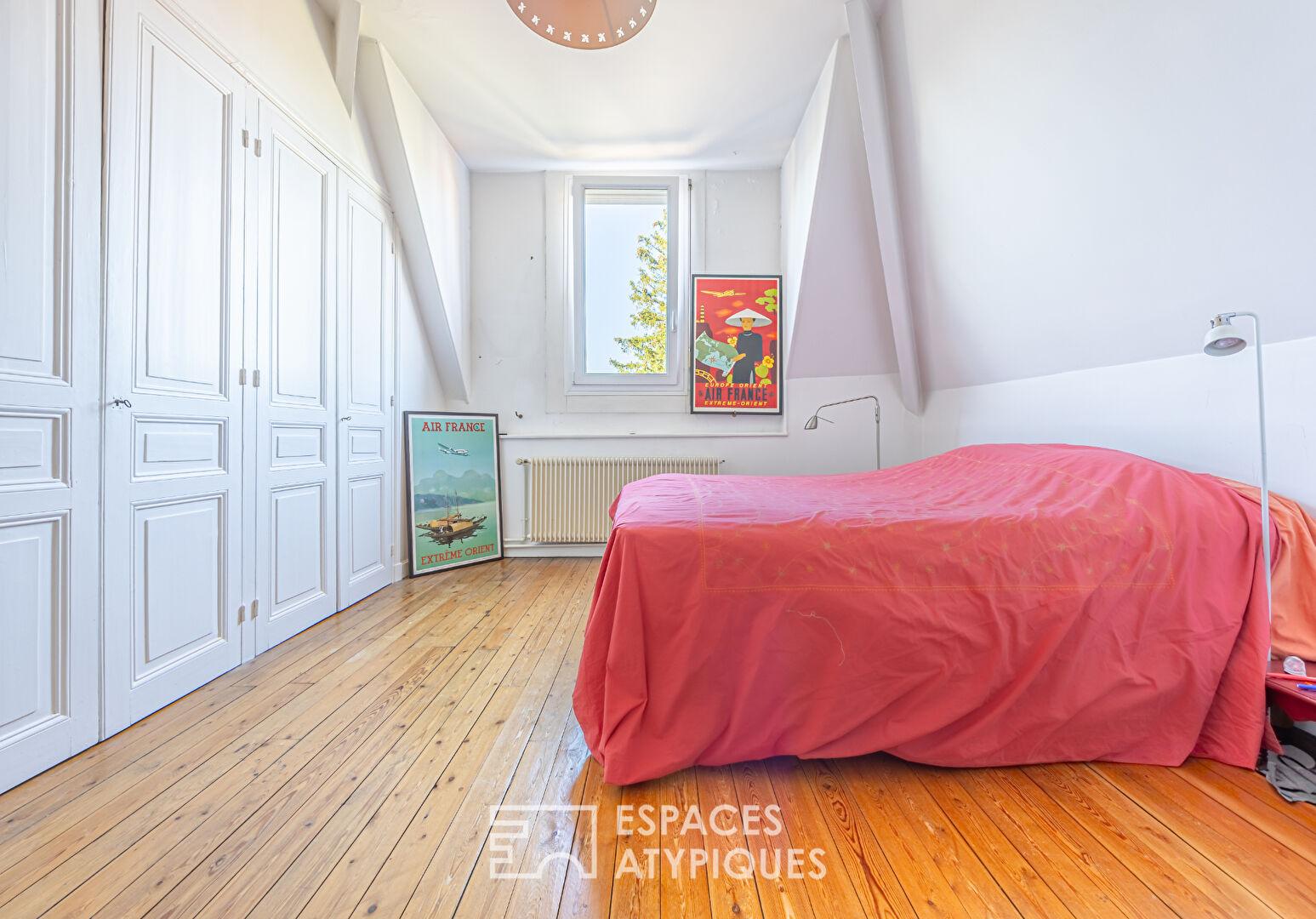 Les deux étages supérieurs, pensés comme un appartement privé, s’ouvrent sur un espace de vie chaleureux : un vaste salon-séjour baigné de lumière, rehaussé par une cheminée en marbre et son trumeau, une cuisine conviviale, cinq chambres spacieuses, ainsi qu’une salle de bains (douche et baignoire).