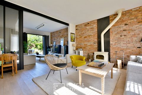 L’entrée de la maison amène vers une grande pièce de vie lumineuse parfaitement exposée ouverte sur une terrasse et un jardin paysager sans vis à vis. Ce double salon paré d’un magnifique mur de briques est chauffé par un poêle à bois lui conférant une atmosphère chaleureuse.