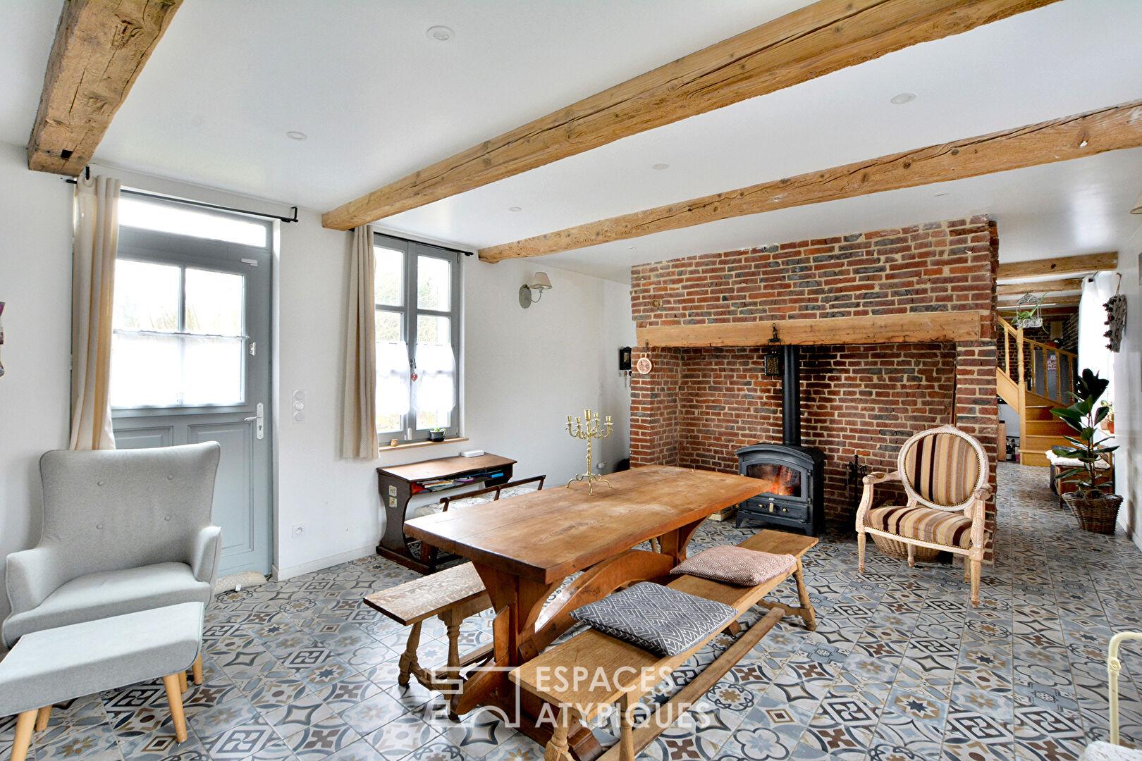 La maison s’ouvre sur une très grande pièce de vie offrant deux espaces distincts chauffés chacun par un poêle à bois et séparés par une très belle cheminée picarde. D’une part le salon salle à manger très agréable et lumineux permet de passer de chaleureux moments en famille. De l’autre, une pièce conviviale avec son billard et sa cuisine ouverte équipée.