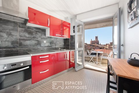 La cuisine, quant à elle, s’ouvre sur un balcon privatif exposé OUEST, offrant une vue splendide sur la majestueuse Sainte Cécile, dont il est peu probable de se lasser.