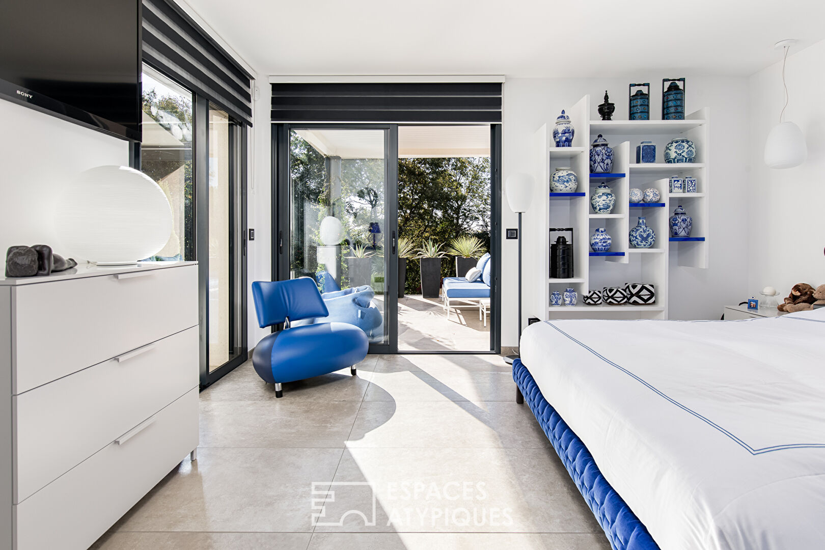 Le modernisme est de mise avec cette belle contemporaine nichée dans un environnement proche de la nature .