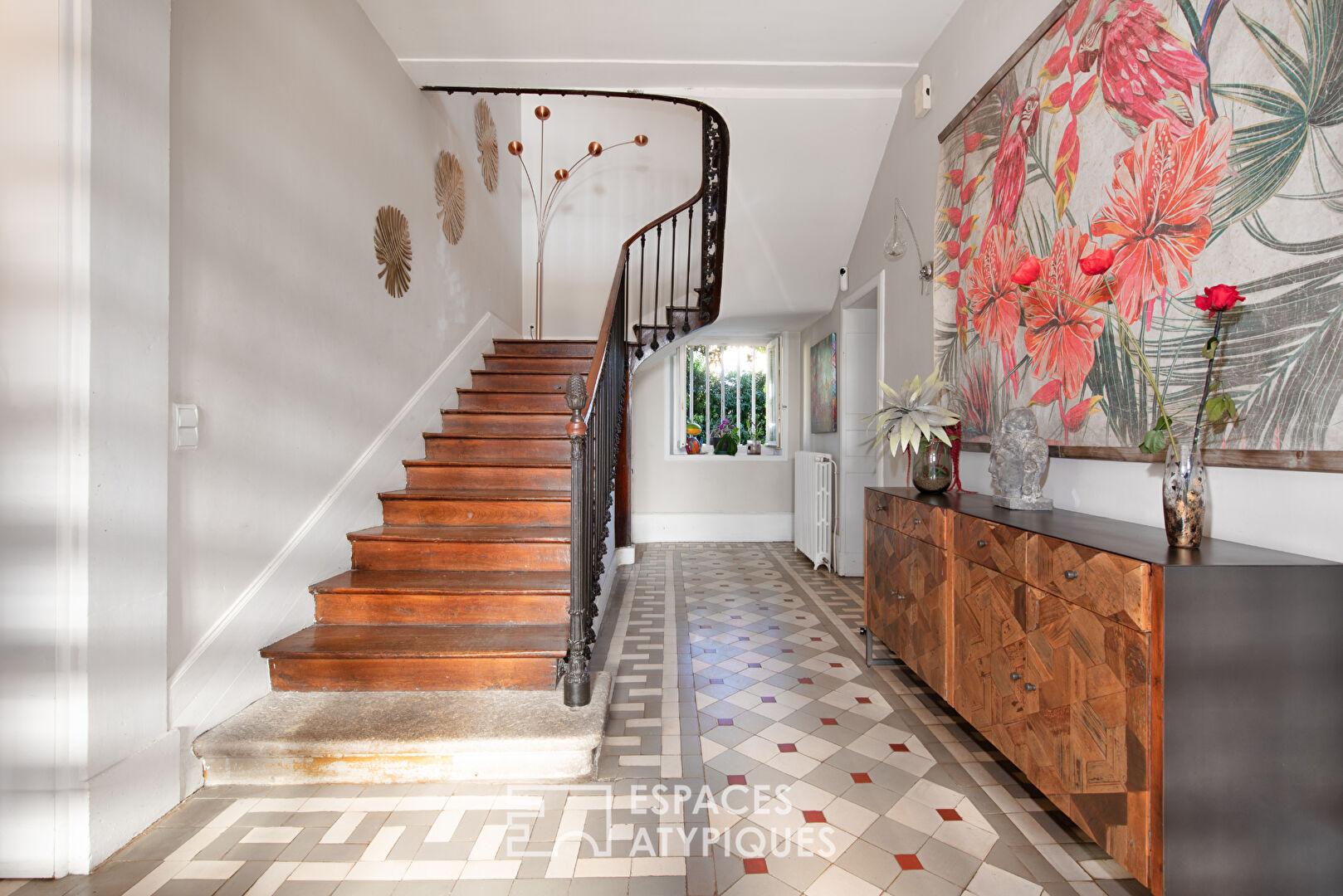 La porte s’ouvre sur un hall majestueux aux carreaux de ciment d’origine menant à un superbe escalier en bois.