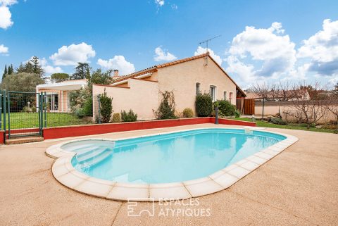 À l’extérieur, la maison s’ouvre sur un vaste jardin arboré, agrémenté d’une piscine propice à la détente. Une grande terrasse, protégée par une pergola, constitue un véritable prolongement des espaces de vie, idéale pour les moments de convivialité.