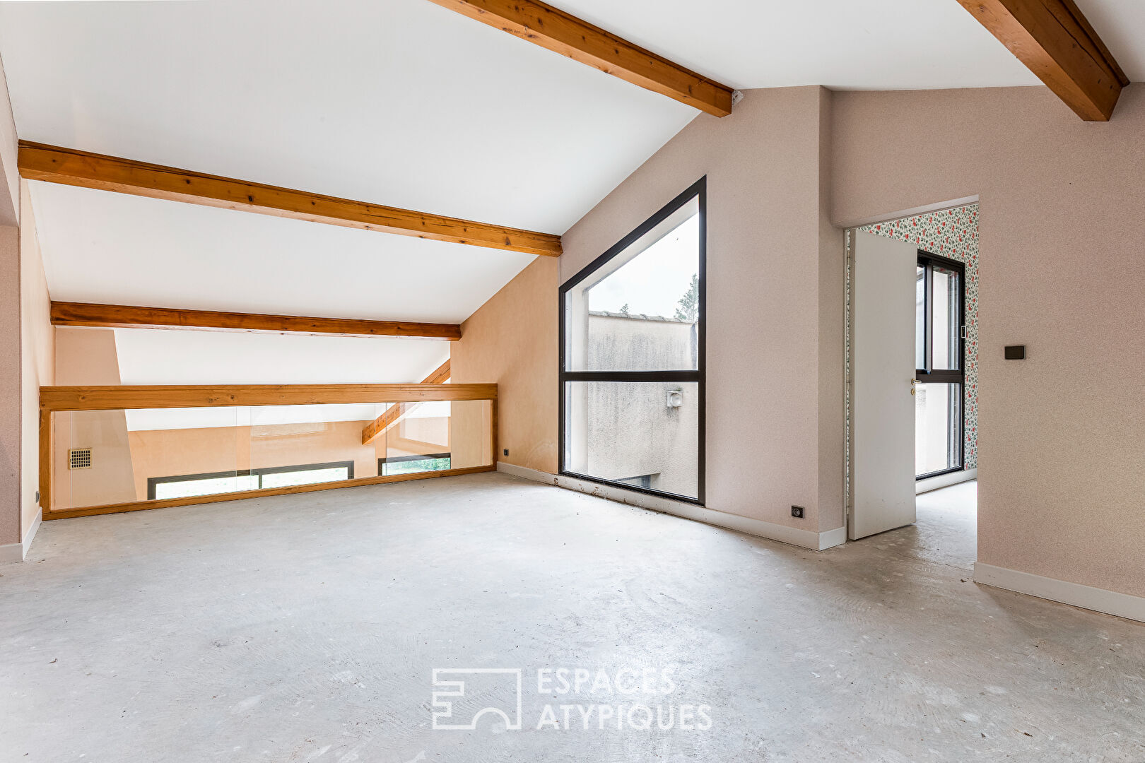 Ici, un sol béton laissé brut unifie les différents espaces aux fenêtres à découpes géométriques, dont deux chambres et une salle d’eau supplémentaire.