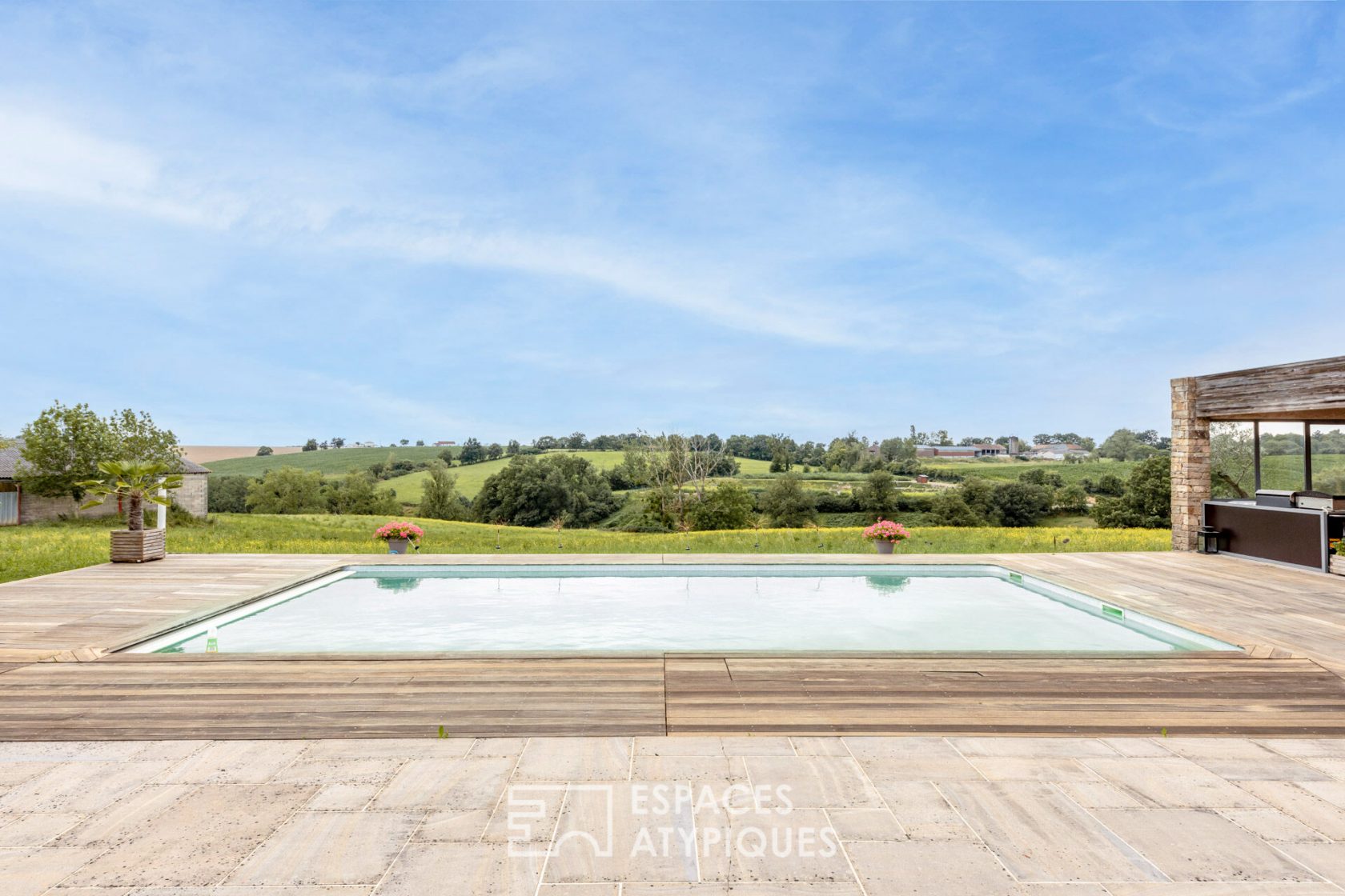 L’extérieur est aussi un bel atout, une terrasse spacieuse avec piscine pour profiter de cette vue dégagée sur la campagne alentour. Un jardin paysager permet de profiter des beaux jours et du calme environnant dans les meilleures conditions.