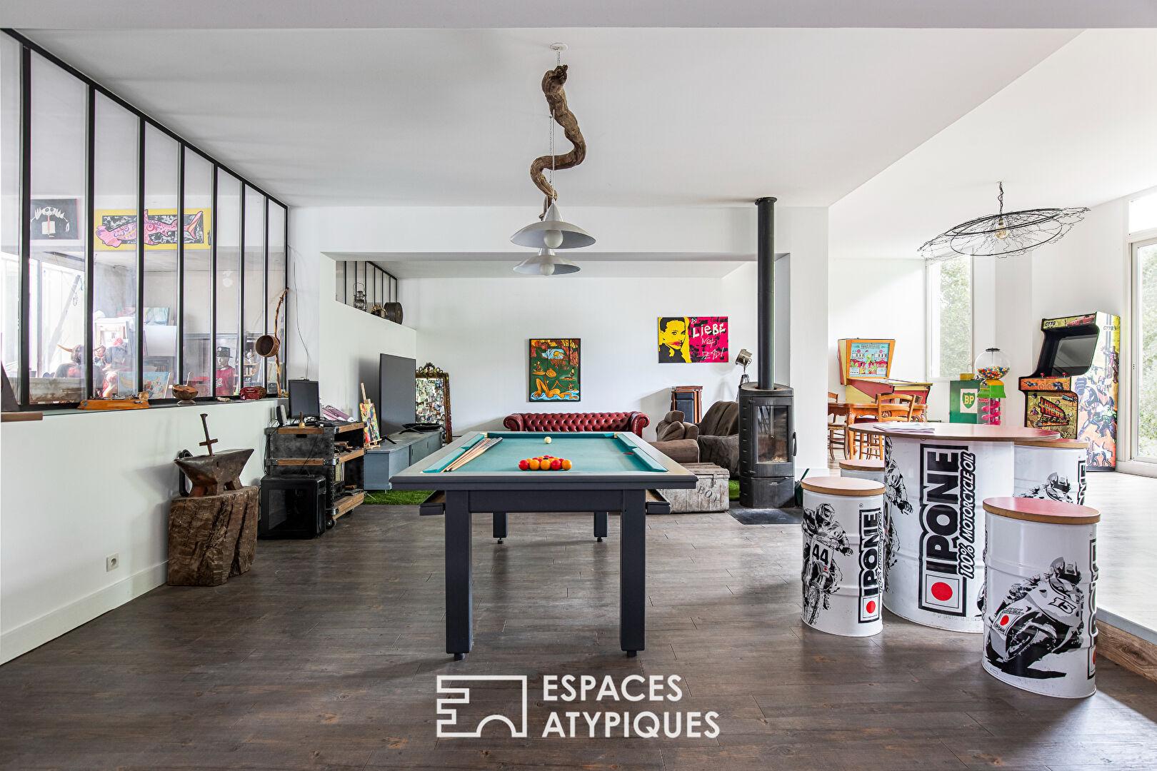 Côté habitation, l’entrée s’ouvre sur une pièce atelier d’artiste entièrement vitrée et une vaste pièce de vie de plus de 100 m2, avec cuisine ouverte, poêle à bois et larges fenêtres donnant sur la rivière.