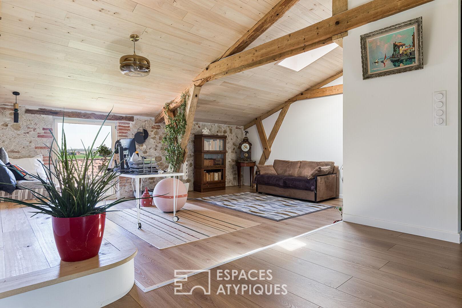 À l’étage, plusieurs chambres spacieuses prolongent cette sensation d’espace, dont une suite avec salle de bain et dressing. Un dortoir, un atelier et un espace de travail complètent l’ensemble, laissant place à de nombreux projets de vie.