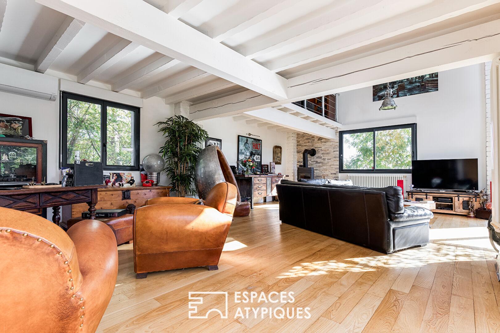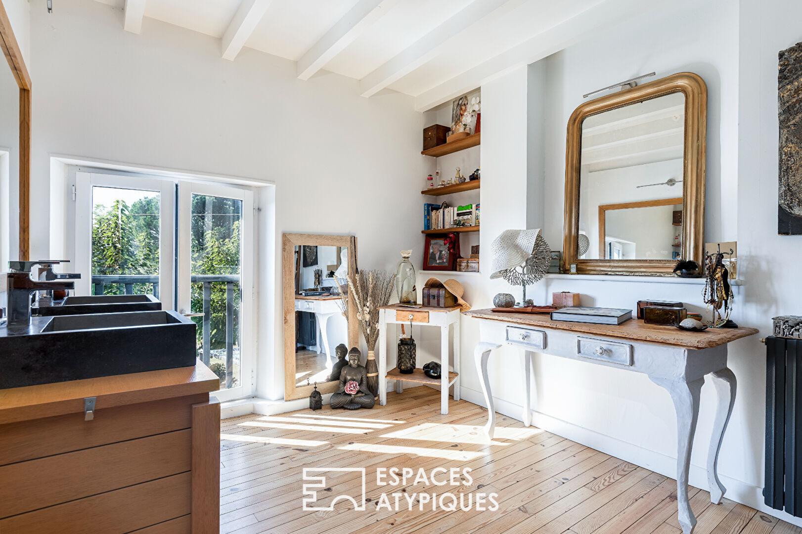 Les 240 m² habitables abritent aujourd’hui au rez-de-chaussée une cuisine et son arrière-cuisine, une salle à manger et un salon cathédrale et, à l’étage, le coin nuit une petite suite avec salle d’eau privative, deux chambres et une salle d’eau aux dimensions plus que généreuses, ainsi qu’une mezzanine aux vocations multiples.