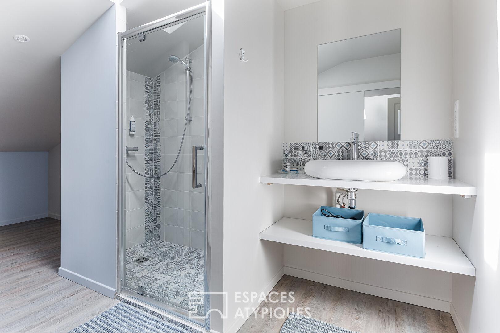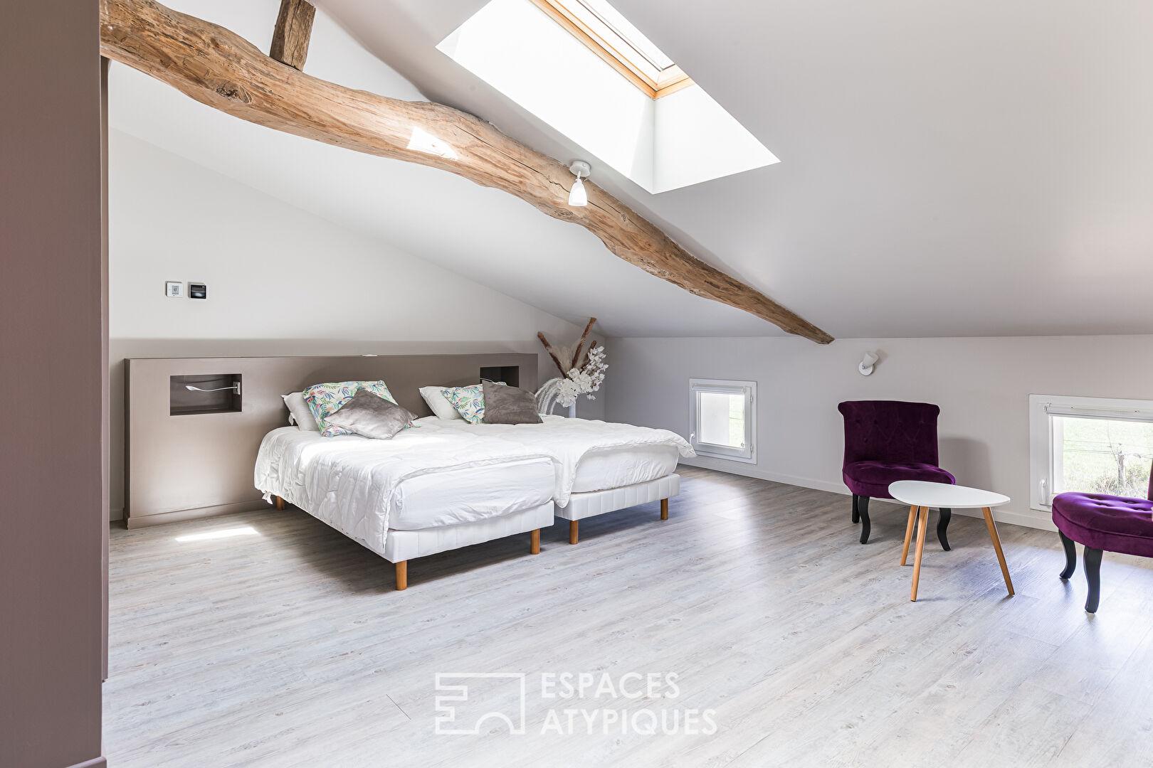 L’espace nuit privatif accueille quatre chambres en suite, dont une en rez-de-chaussée et une avec baignoire, dans une atmosphère chaleureuse et raffinée.