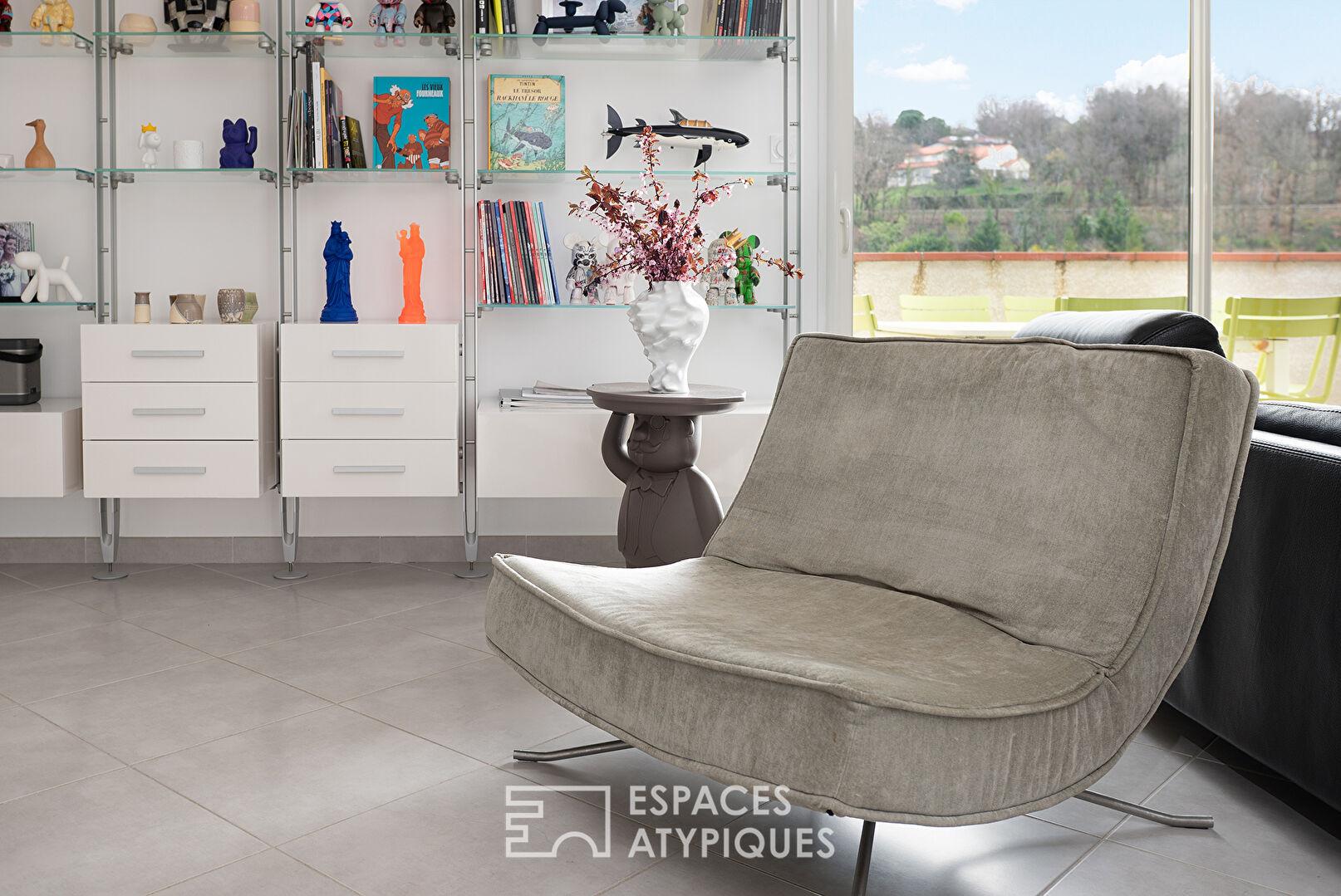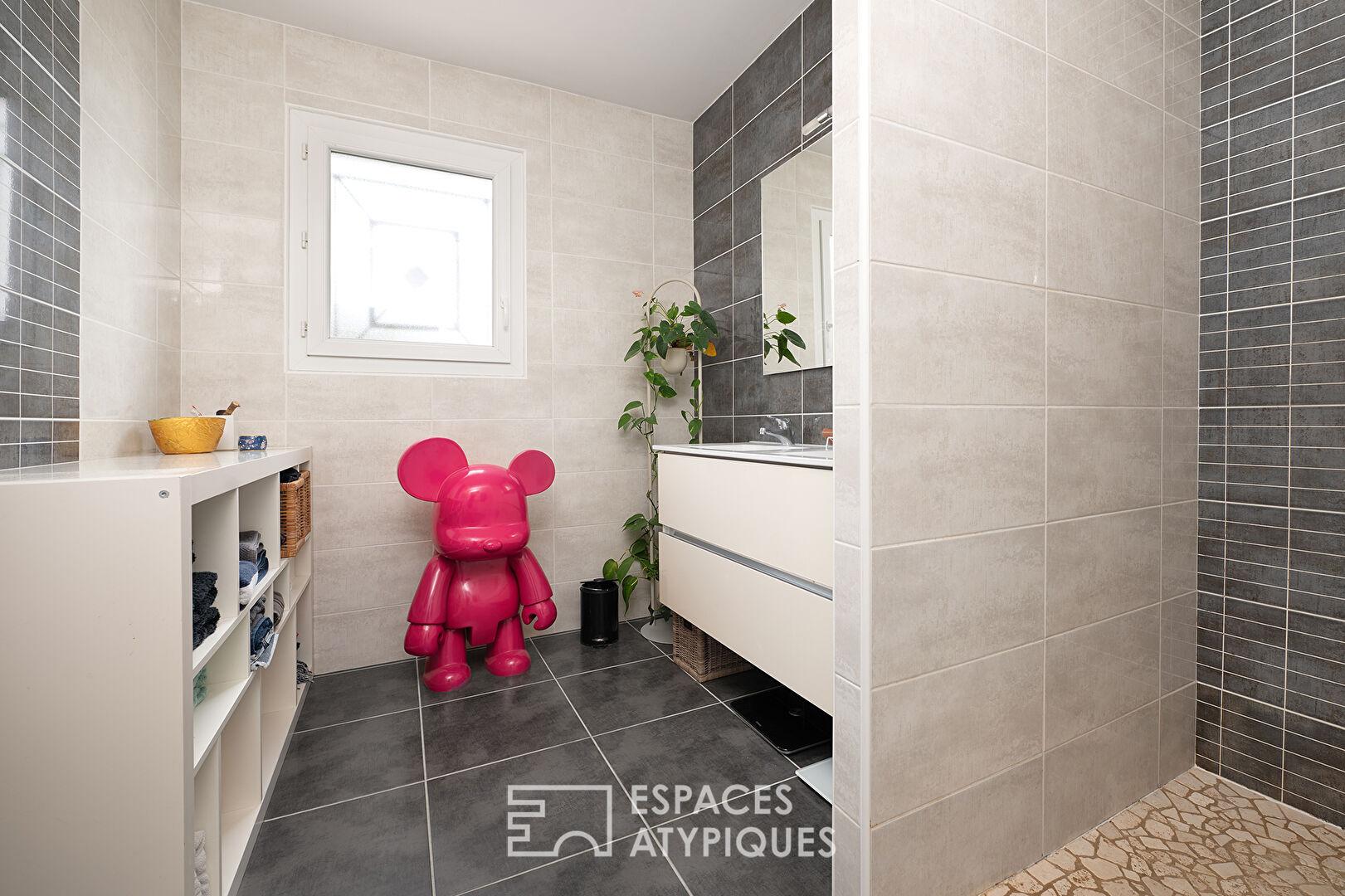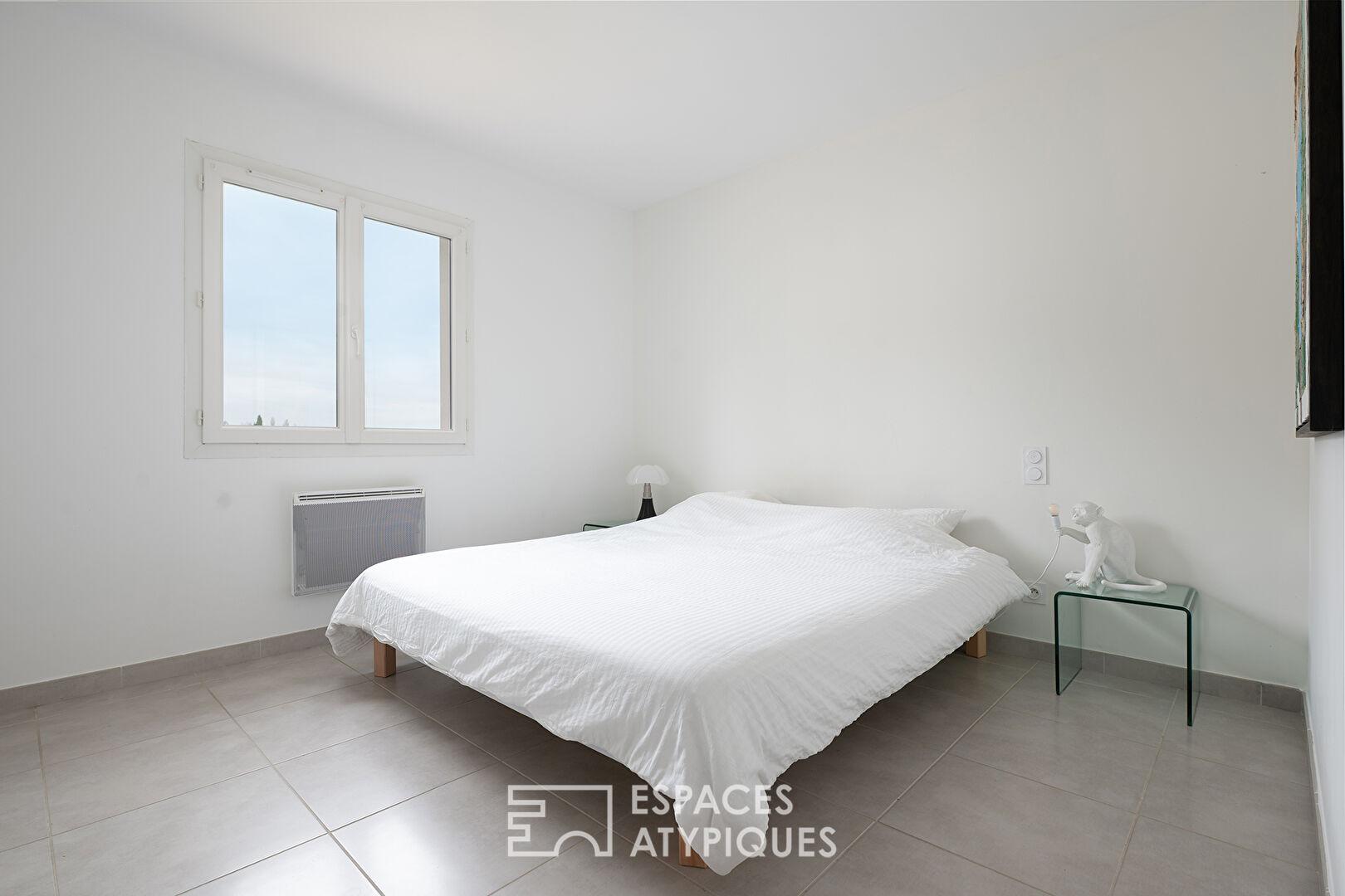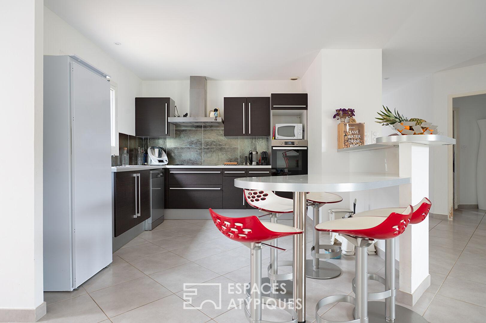 Conçue pour s’adapter à la déclivité naturelle du terrain, elle offre une organisation fluide des espaces et une belle luminosité.