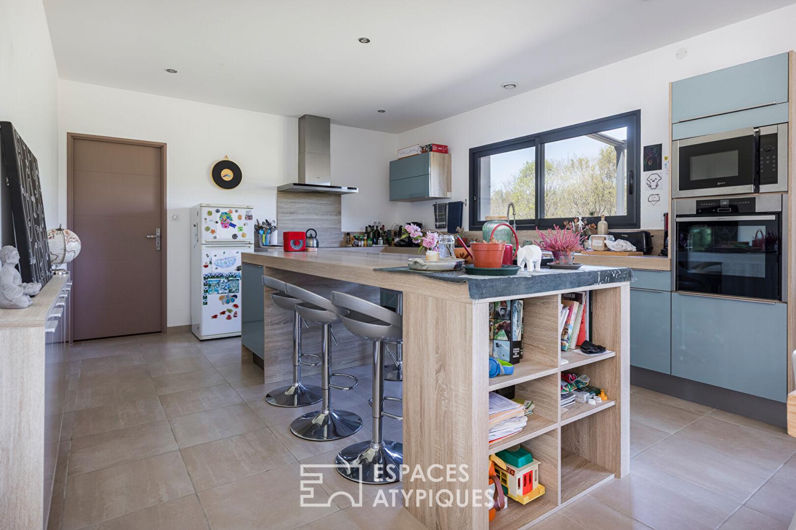 Construite en 2015 avec des matériaux de qualité, la maison séduit par ses volumes généreux et sa luminosité omniprésente. L’espace de vie s’organise autour d’un vaste salon-salle à Manger ouvert sur une cuisine dînatoire entièrement équipée. L’ensemble s’ouvre sur une terrasse avec double pergola bioclimatique, créant une parfaite continuité entre intérieur et extérieur.