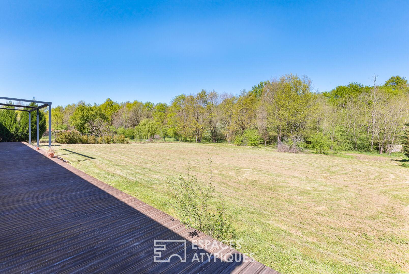 Édifiée sur un parc paysager de plus de 5000m², sans vis-à-vis et pouvant accueillir une piscine, elle offre un cadre de vie rare, entre nature et proximité immédiate des commodités.