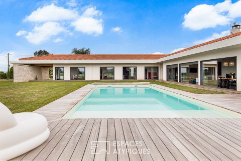 Située entre Montauban et Agen, secteur Valence d’Agen, cette contemporaine signée d’un cabinet d’architecture reconnu développe 235m² sur une parcelle de 5750m².