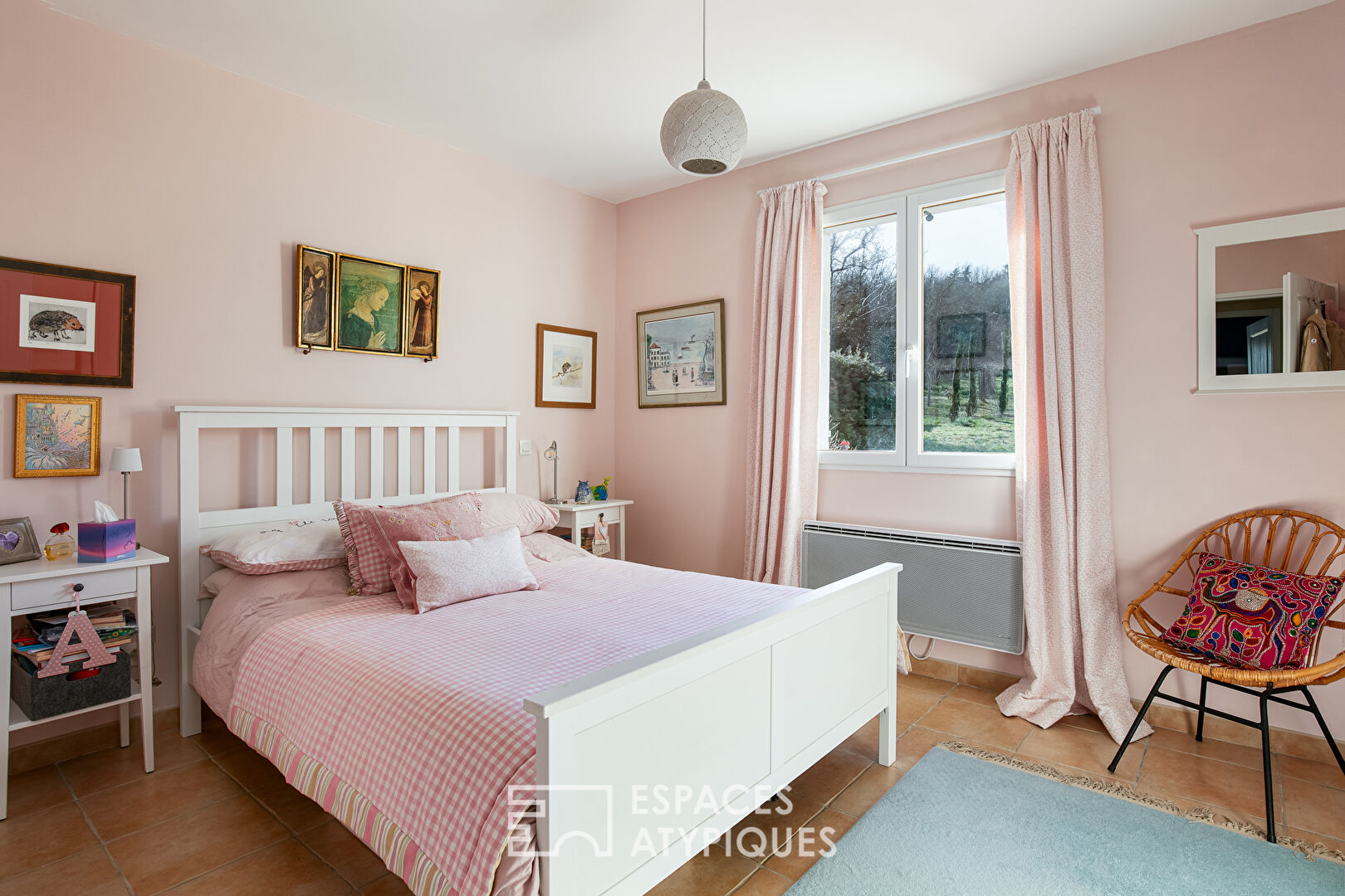 Dès l’entrée, un vaste séjour traversant baigné de lumière crée une atmosphère chaleureuse et conviviale. La cheminée insert renforce le confort de cet espace de vie ouvert sur le jardin. La cuisine équipée s’intègre harmonieusement dans l’ensemble. Un cellier attenant facilite le quotidien. L’espace nuit se compose de trois chambres aux volumes généreux, d’une salle de bain équipée d’une baignoire et d’une douche, ainsi que de toilettes indépendantes. Une buanderie et un garage complètent les prestations intérieures.