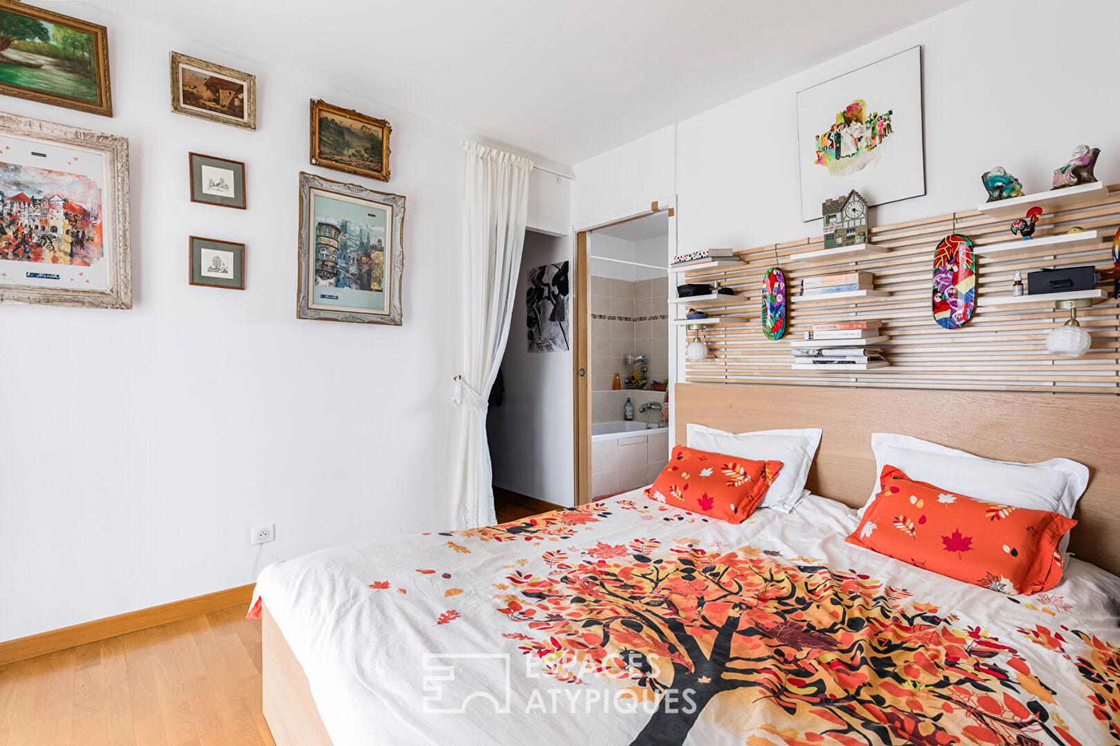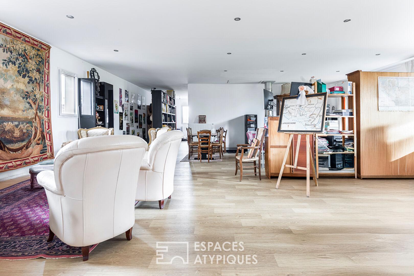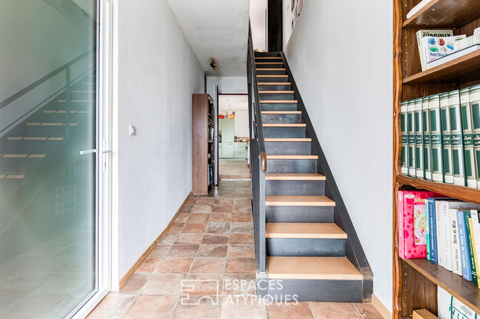 L’escalier en métal au style industriel donne accès à l’étage. l’espace centrale offre des possibilités d’utilisation multiples notamment la création d’une salle de jeux ou d’un espace de télétravail. Deux chambres avec leurs accès balcons et une salle de douche à partager complètent l’étage.