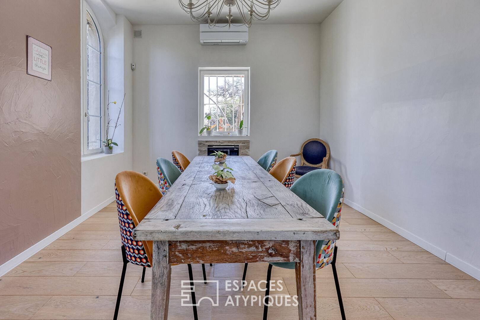 Dès le seuil franchi, l’âme de la demeure se révèle : grandes hauteurs sous plafonds, cheminées en marbre et fenêtres en plein cintre diffusent une lumière douce et sculpturale.
