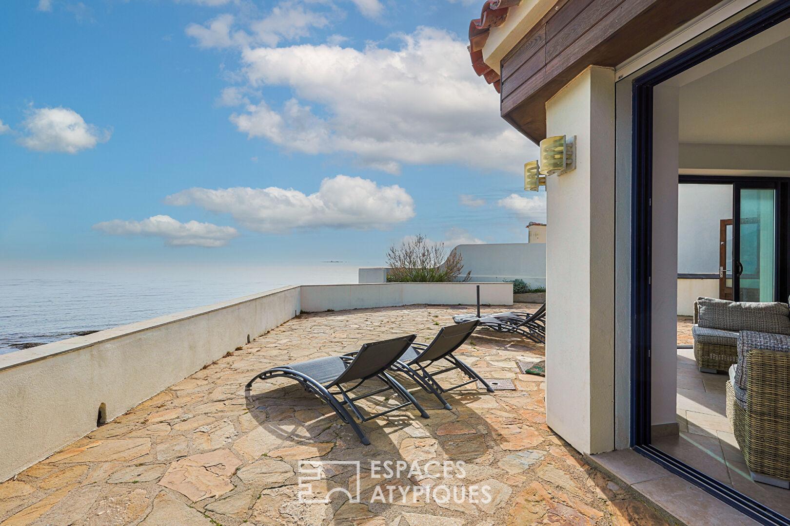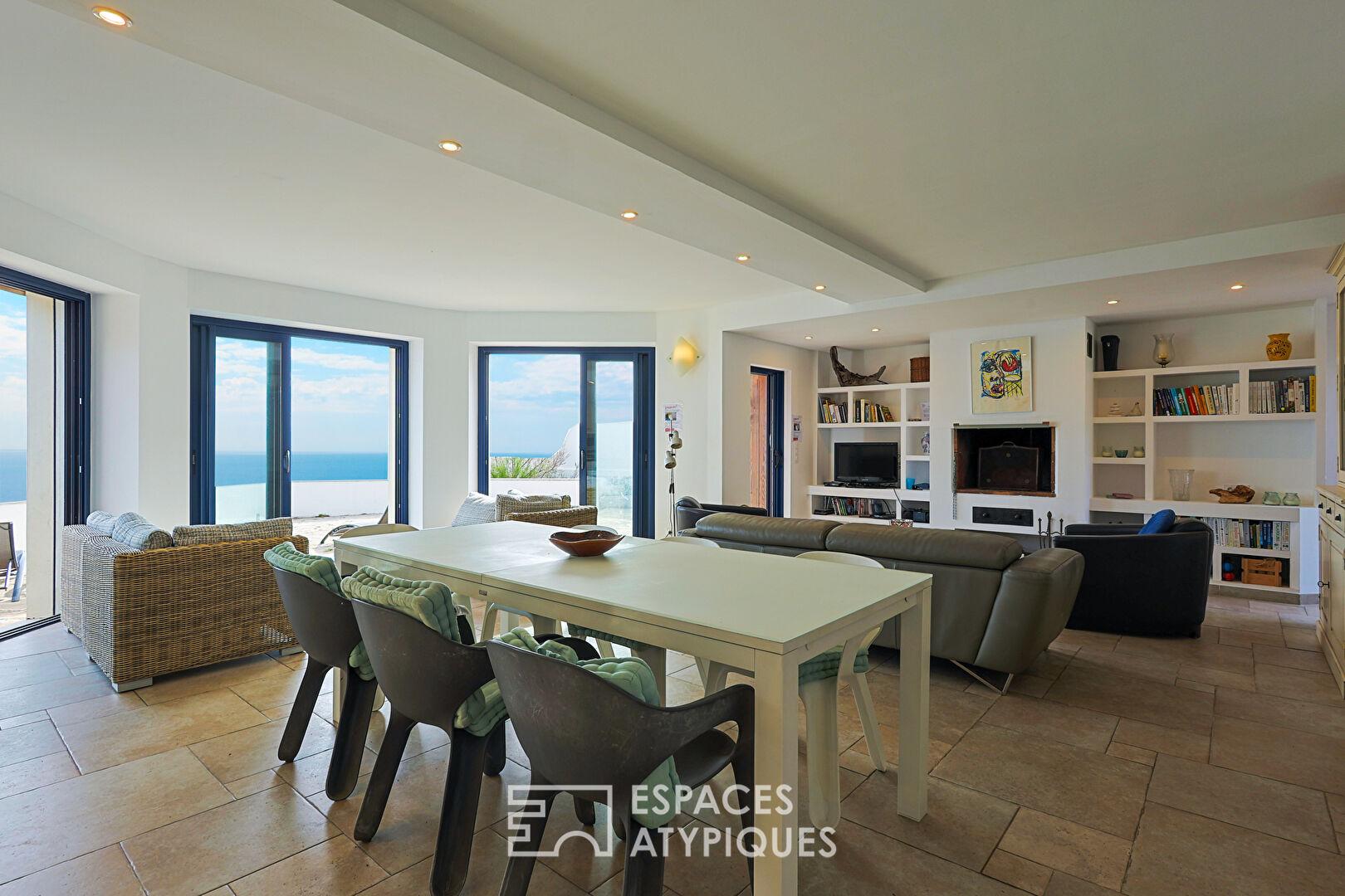 Au rez-de-chaussée, un vaste salon baigné de lumière naturelle vous accueille avec ses grandes baies vitrées et s’ouvre sur une spacieuse terrasse face à la grande bleue. La cuisine, ouverte sur le salon, est un espace convivial et fonctionnel, idéal pour préparer de délicieux repas tout en admirant le paysage marin. Une suite de plain pied complète harmonieusement ce niveau.