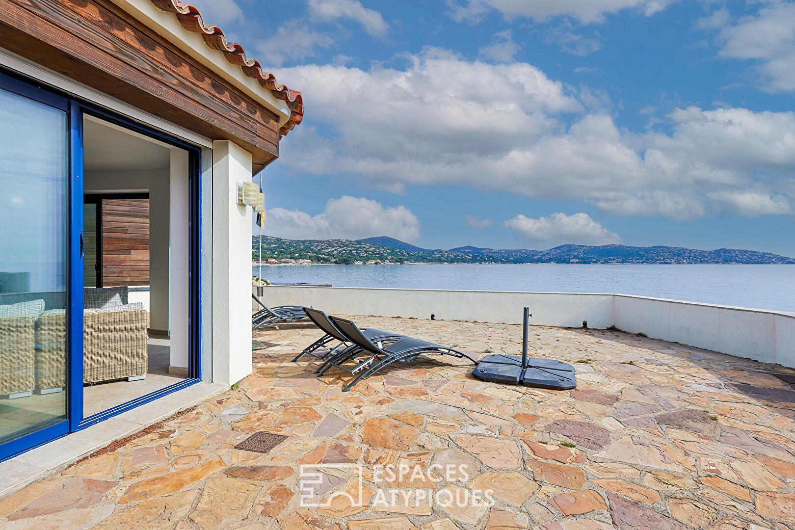 Cette villa pieds dans l’eau, se love entre la plage de la Nartelle et la pointe des Sardinaux dans la station balnéaire très prisée de Sainte-Maxime. D’une superficie totale de 177 m2 répartie sur deux niveaux, cette résidence rénovée au style contemporain offre un cadre de vie luxueux et confortable et nous plonge dans l’atmosphère envoûtante de la côte d’azur.