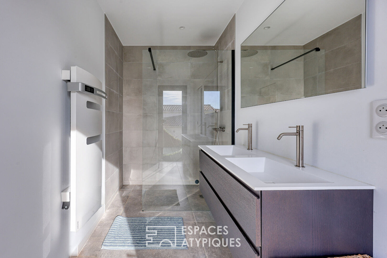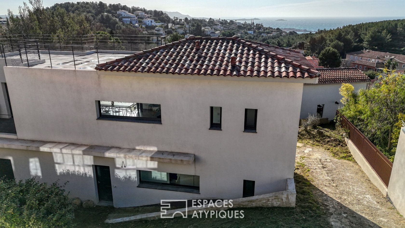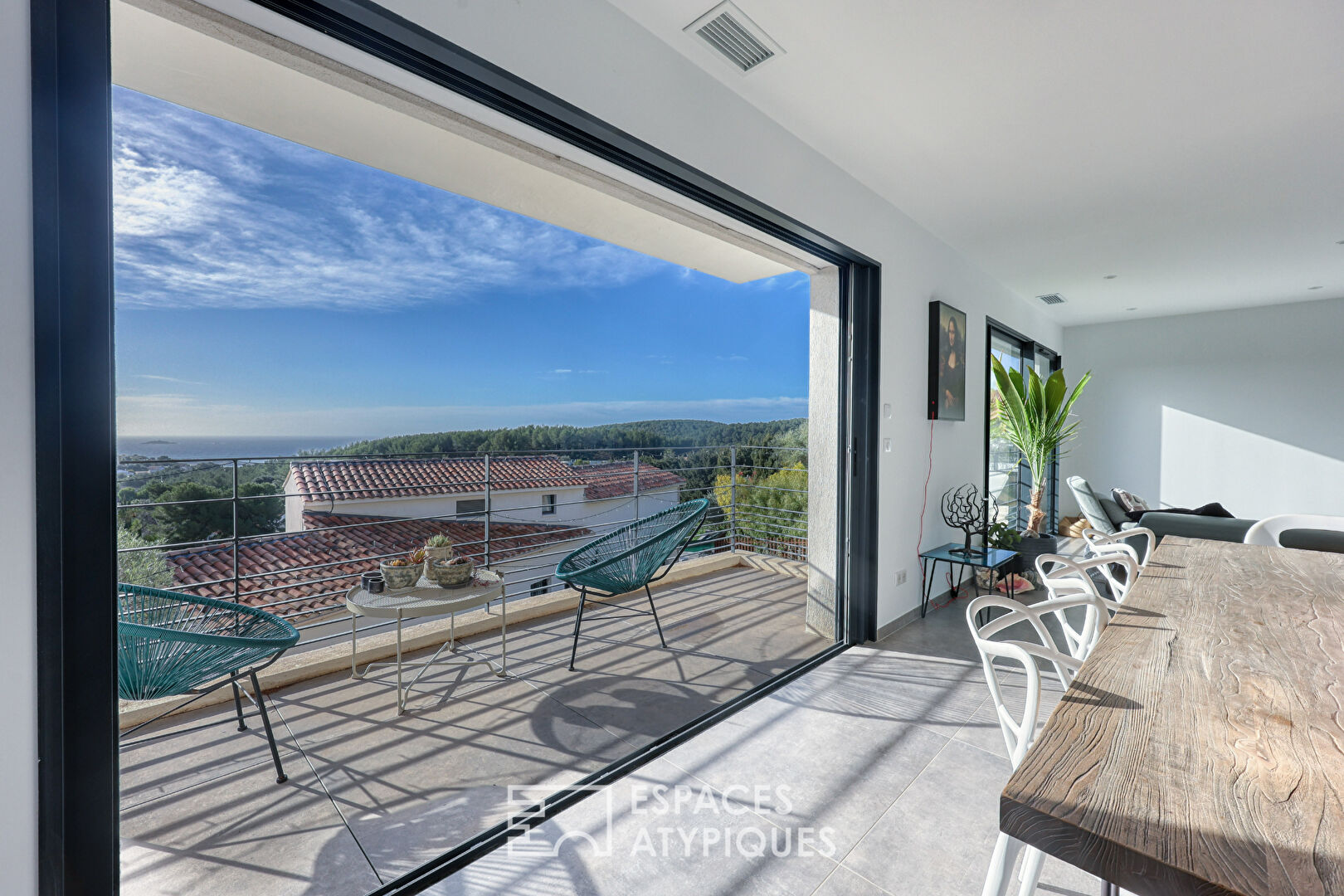 Sur deux niveaux, l’espace se déploie avec une fluidité déconcertante, baigné par la lumière du Sud. L’accent est mis sur l’expérience visuelle : depuis la superbe pièce de vie à l’étage, le bleu de la Méditerranée est une toile de fond omniprésente.