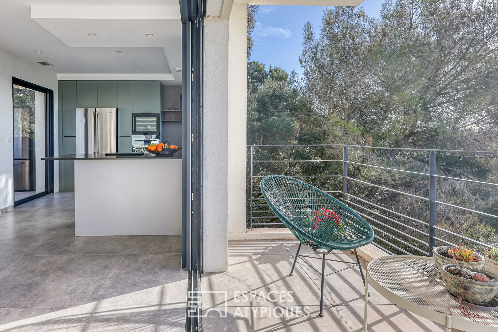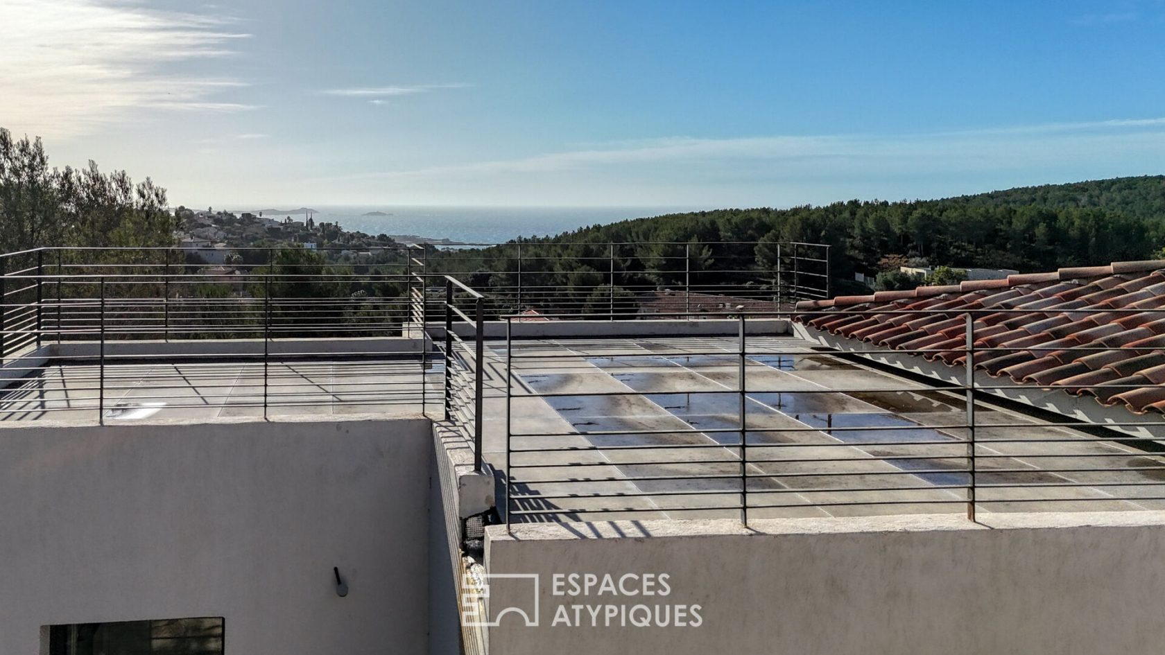 Une large baie à galandage mène à la terrasse Nord, antichambre d’un futur Rooftop (escalier à venir), promettant des soirées à ciel ouvert inoubliables. Côté mer, un balcon terrasse se prête à vos pauses rêveuses.